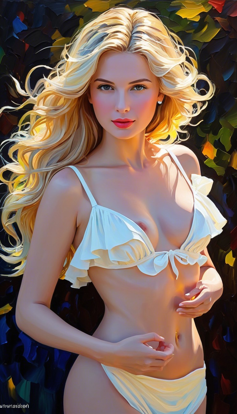The image features a woman with flowing blonde hair, wearing a colorful, artistic robe. Her striking expression and the vibrant background enhance the lively, expressive atmosphere.