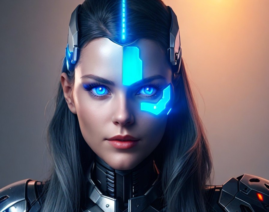 A woman with cybernetic enhancements and glowing blue eyes exudes a futuristic aura.