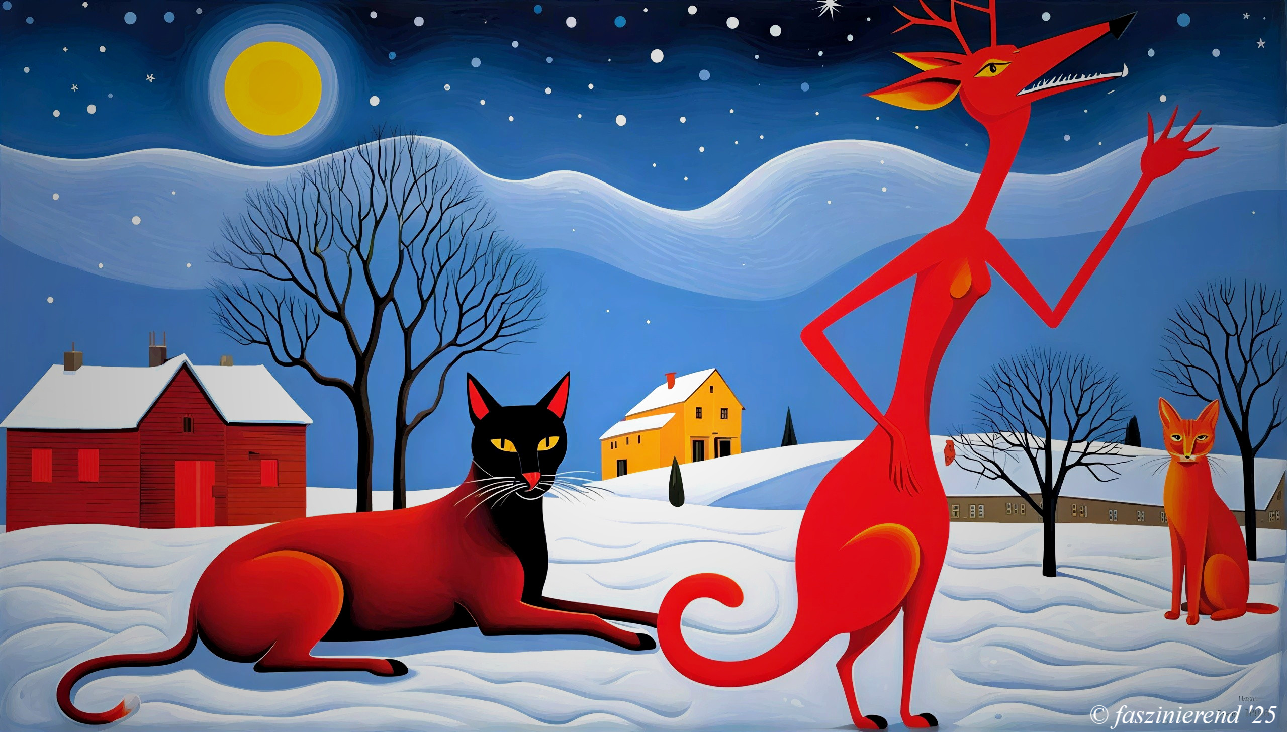 A flat art style winter night landscape with a large black cat with red fur on its back and sides, and yellow eyes. To the right, a tall, slender red deer with antlers, orange ears, and yellow eyes, stands on two hoofed feet. The deer has a bird perched between its