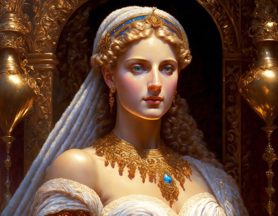 An illustration of a woman with blond hair adorned with a jeweled headpiece, wearing a blue dress with gold trim, set against an ornate background.