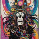 A striking portrait of a girl with flowing black hair, surrounded by vibrant swirls of color. Her expression is serene yet intense, blending fantasy elements with intricate patterns.