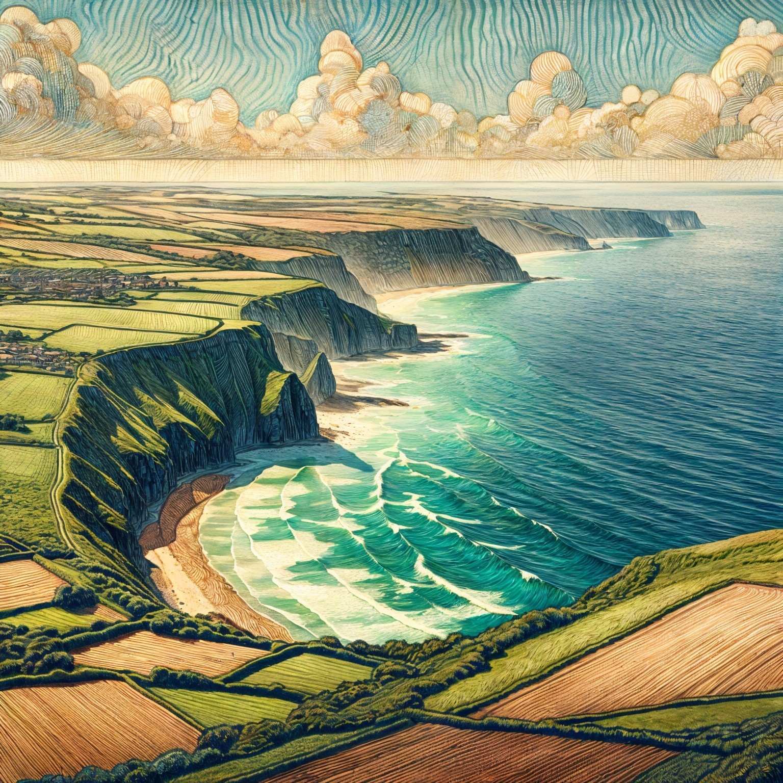 This vibrant landscape features dramatic cliffs meeting the ocean, surrounded by lush fields and farmland. The scene is alive with color, showcasing a stunning blend of nature and agriculture.
