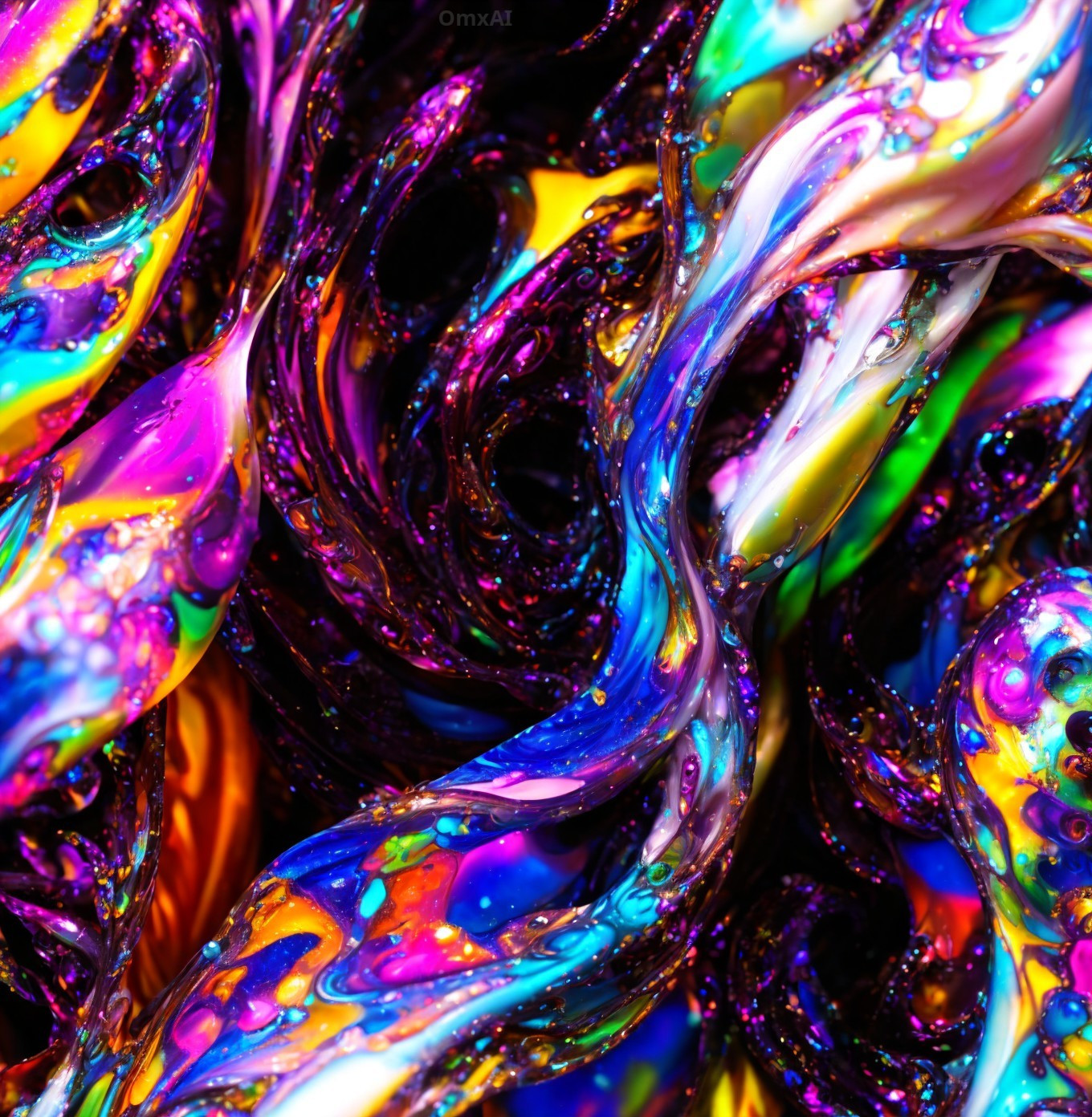 A close-up of colorful, swirling patterns with a glossy, liquid texture, featuring vibrant blues, purples, and oranges.