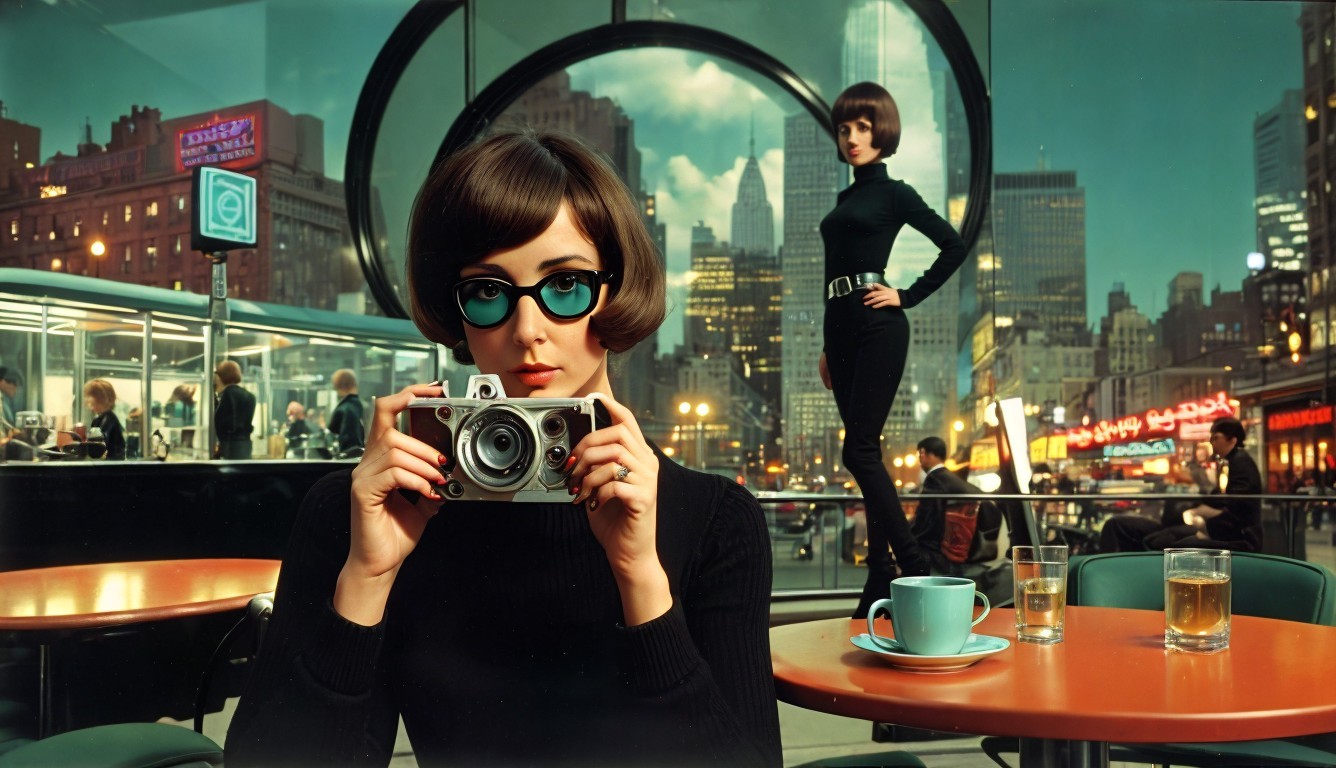 A stylish woman with sunglasses poses with a vintage camera in a retro-futuristic city diner, another woman stands behind observing.