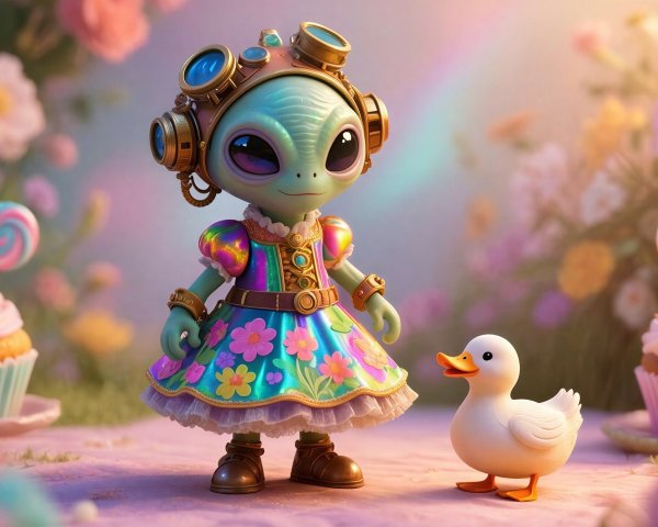 A colorful LEGO scene features a character with a fox-inspired costume and a playful expression, standing on a sandy shore next to a bright yellow duck, with a scenic background of buildings and palm trees.