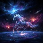 A mystical horse gallops through a celestial landscape, its shimmering coat reflecting stars and cosmic colors, framed by a starry sky and ethereal clouds. Magic and beauty intertwine.