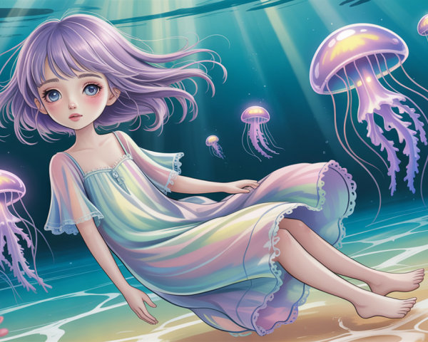 A whimsical scene unfolds as a charming girl in a delicate nightgown drifts gracefully underwater, surrounded by shimmering fish and vibrant coral, creating a magical and serene atmosphere.