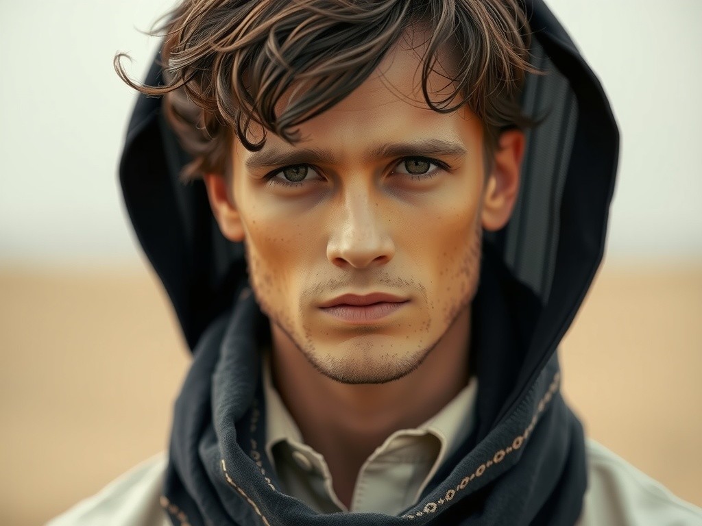 A young man stands confidently in a barren landscape, his tousled dark hair and intense brown eyes capturing attention. Dressed in a light shirt and patterned scarf, he embodies resilience amidst isolation.