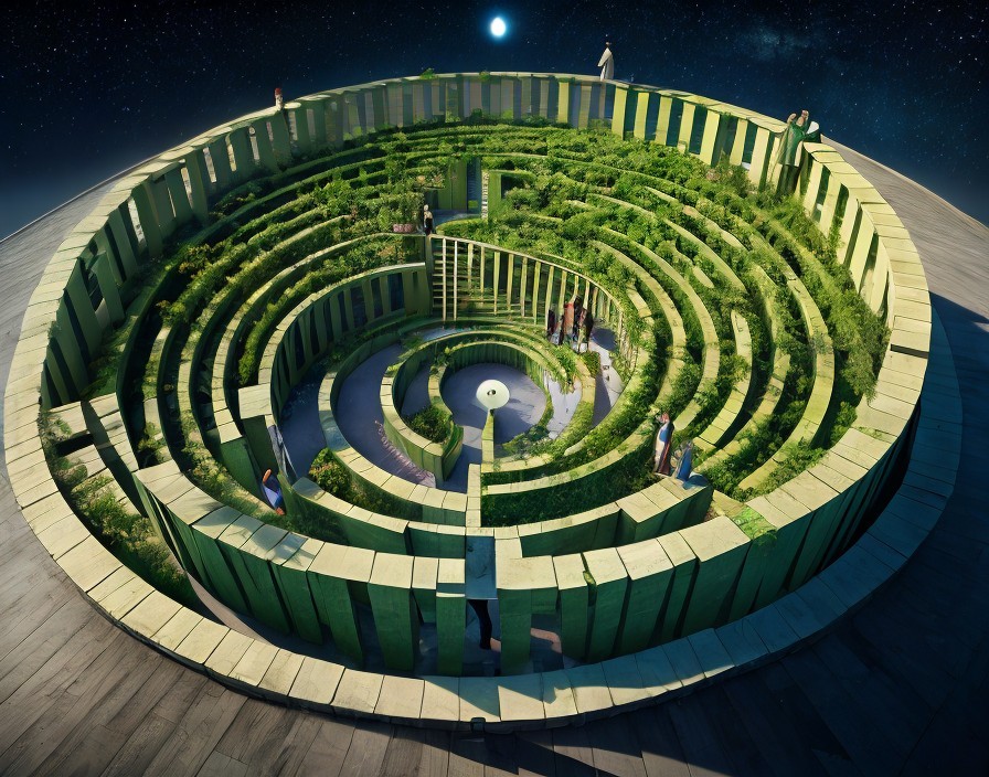 A person stands before a surreal circular labyrinth under a night sky, with a cityscape and nature merging at the horizon.