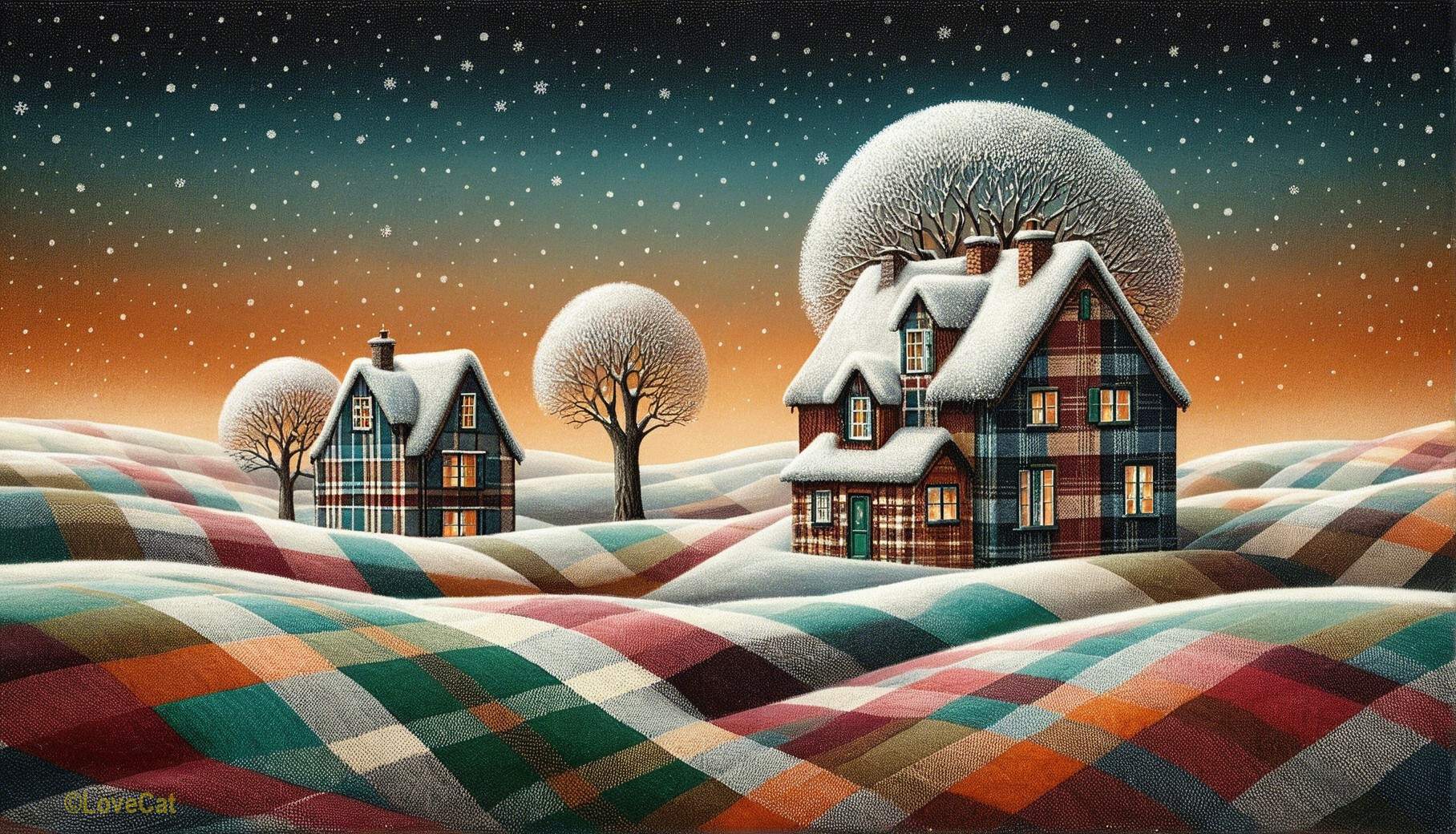 Prompt: "A breathtaking digital painting in the style of Ukiyo-e, painting, and anime showcases a serene winter night landscape, dominated by a giant full moon and a smaller, golden crescent moon illuminating a small, illuminated pagoda nestled amongst snow-covered, flowering trees and imposing rocky mountains, all beneath a vast starry blue sky. In the foreground, a frozen lake reflects the moonlight, upon which a solitary house stands proudly, its warm, golden windows beckoning and encircled by delicate, sparkling decorations and a beautifully adorned New Year's tree, creating a haven of inviting warmth amidst the gentle snowfall. Deep within a dark and gloomy forest at dusk, tall, thick trees with snow-covered branches frame a small house with a pointed roof, emanating a comforting yellow light, further enhancing the tranquil atmosphere of love and serenity."