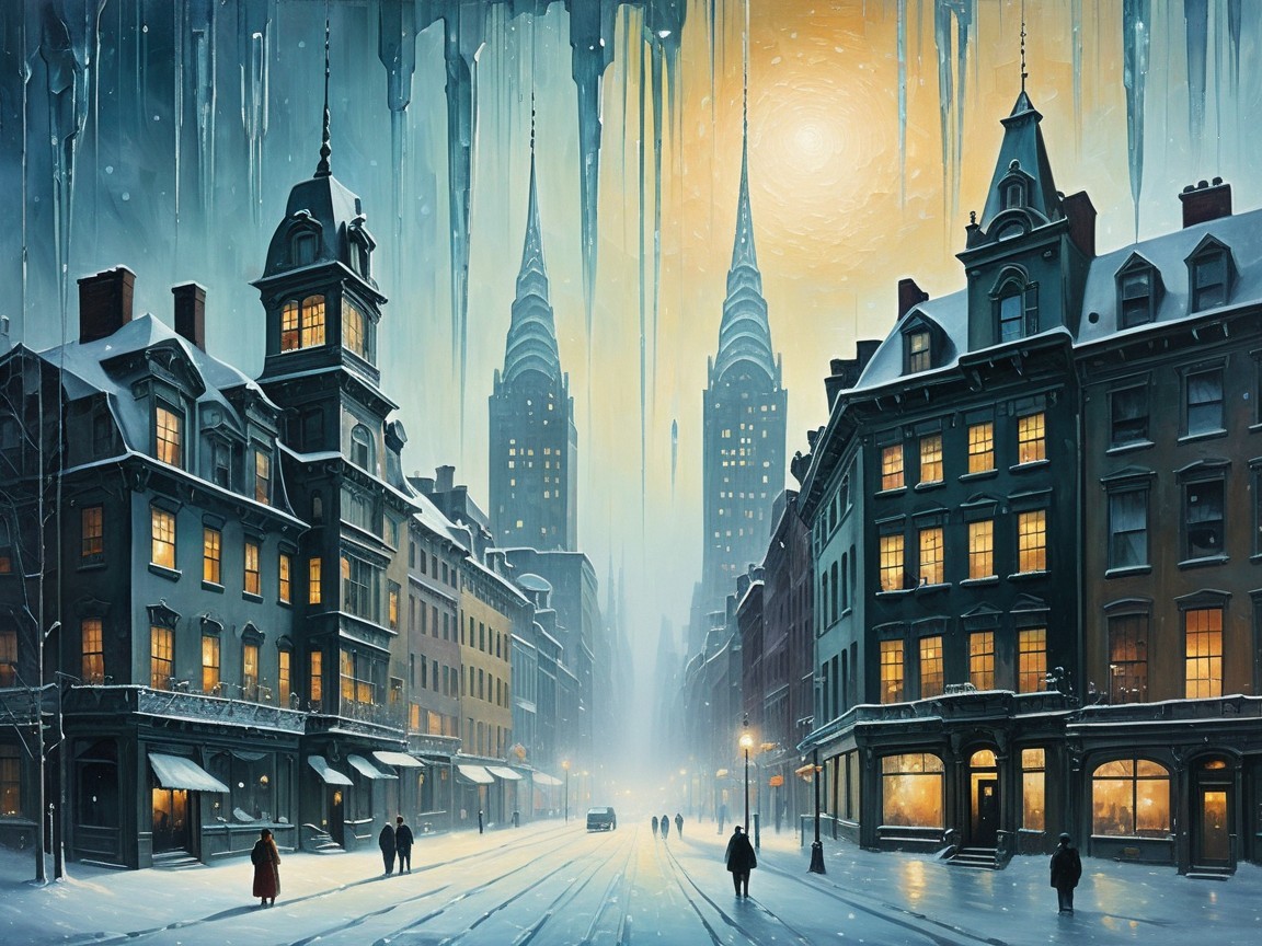 Prompt: Surrealism, vintage, Impressionist oil painting. Double exposure with background. Medium shot. A abstract enigmatic unparallel dreams, night mist in serene sky 18th century winter New York city sky buildings with crystal icicles on roofs sparkling snow frozen surfaces .Impressionistic art, drip paint technic. A bold faded fractal blocks of muted color vertical gradient features, transfering to blur on outlines, luminous light texture, smalt effect, small strokes painting in details, different gradient sections with rough shadows, patchwork, meticulous intricate pattern unique technic Sargent, Sorolla, Boldini, loose bold brushstrokes, loose carefree paint strokes, insane sequince brush strokes, blurred outline of objects, pastel three colors. Muted color with bright faded outlines. Mystical enigmatic style. Arty details inspired by Kusama and Beksiński. Cool, shimmering light. Clear mute colors, masterpiece, detailed, high quality, Claude Monet, Catrin Welz-Stein, Igor Maykov, Meghan Duncanson, Yayoi Kusama, surrealism, vintage canvas. 8k