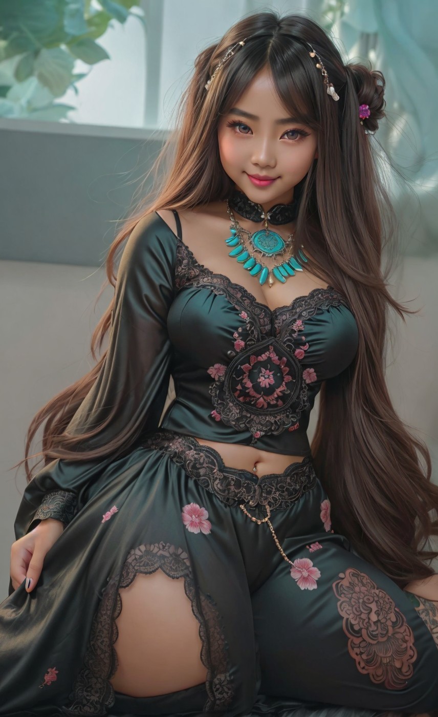 Prompt: cute thick volupotous, turquoise eyes, dark tanned skin, petite gothic Chinese girl, pale white skin and large gentle smile, giggling, messy very long silky light brown hair, thick plump body, large plump chest, tattoos, thick thighs, big wide hips, bottom heavy body, thick legs, curvy thick, big red large bottom lip, lacy flowy intricate large black and red Victorian gothic gown with high cut up her thigh, silky flowery textured esthetics in fashion, tight straps around thighs, rosy blushed skin, stands on a desolate windswept plain. Her gaze on intricate piece of jewelry clutched in hand. craggy mountains under a perpetual twilight. floating pieces of land in the sky, abstract, graphic novel illustration, heavily influenced by dark romanticism with dramatic chiaroscuro lighting