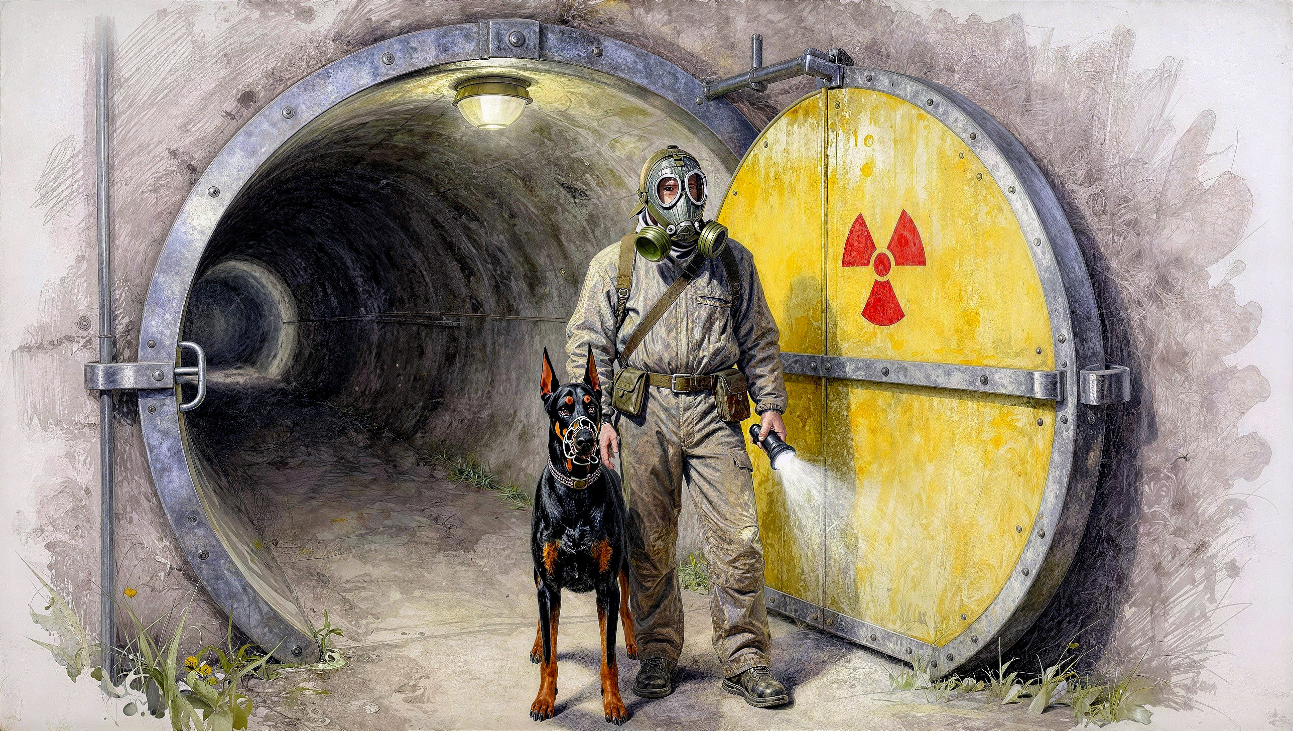 Prompt: A striking oil painting features a pastel A man in a gas mask stands next to a Doberman with a muzzle inside a tunnel. Behind them is a huge circular steel door the diameter of the tunnel. The steel door is yellow and has a red radioactivity symbol on it. The steel door has a steel clasp like a ship's rudder. The inside of the tunnel is dimly lit, lit by an old, ordinary tunnel ceiling lamp. The man is also holding a flashlight, very intricate and detailed details. Thick layers of paint create depth, blending influences from various renowned artists. pencil sketch, Jean-Baptiste Monge