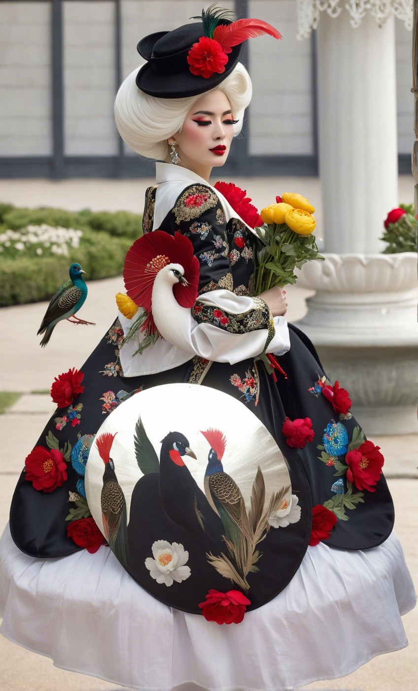 Prompt: Beautiful surreal lady from the 1700s in profile, large white wig with colorful birds, red lips, geisha makeup, white skin, holding a bouquet of ranunculus and peonies, low-cut white dress, black jacket with azuleya motifs, on her head a black tricorn hat with peacock feathers, flower garden background with statues and fountains, art by Tim Burton, Dali, De Chirico, Magritte, Giacomo Balla, surreal, digital art