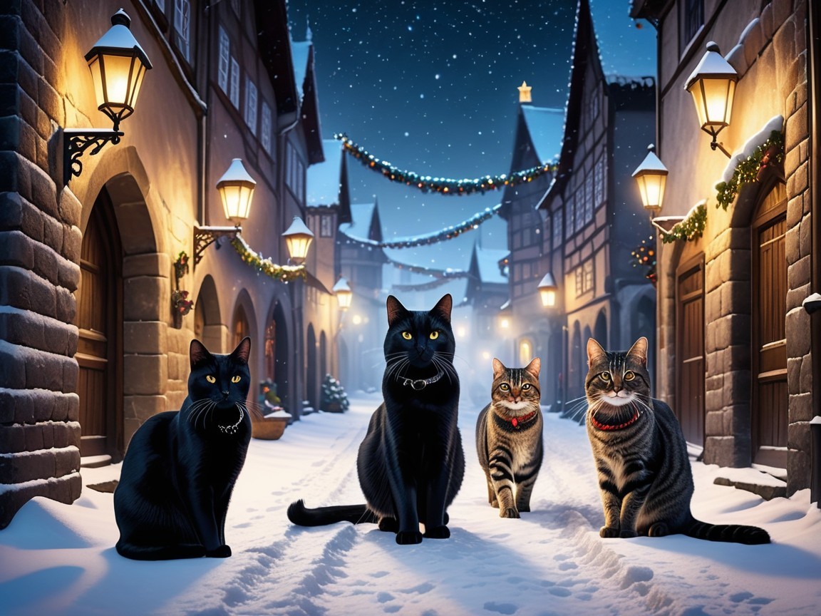 night scene. cats walking along the streets covered in snow. cats going from us. Orange cat, white cat and a tabby cat. Covered in snow except path on the cobblestone street.