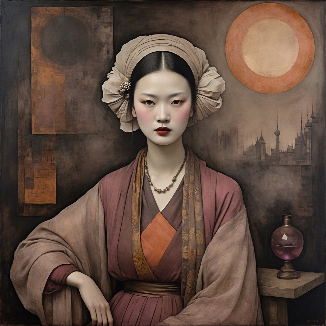 Prompt: I am treacherous with old magic and the noon’s new fury. Old Shanghai. foggy nostalgia, portrait in Burnt umber and soft plum, salmon gold, smoke and mirrors, patina of, battery acid, art brut, moody, somber, desaturated colors, in the style of Paul Klee, Arthur Rackham Dark and moody oil painting of a woman with piercing black eyes, inspired by the works of John Singer Sargent and Edgar Degas, long shot, realistic texture, dramatic lighting, intricate details on clothing and Magical woman fading tones of melancholy and summer nostalgia, soulful portrait, in burnt umber, plutonium, patina of mercury glass, tea stains, art brut, moody, somber, desaturated colors, in the style of Paul Klee, Banksy, Arthur Rackham.