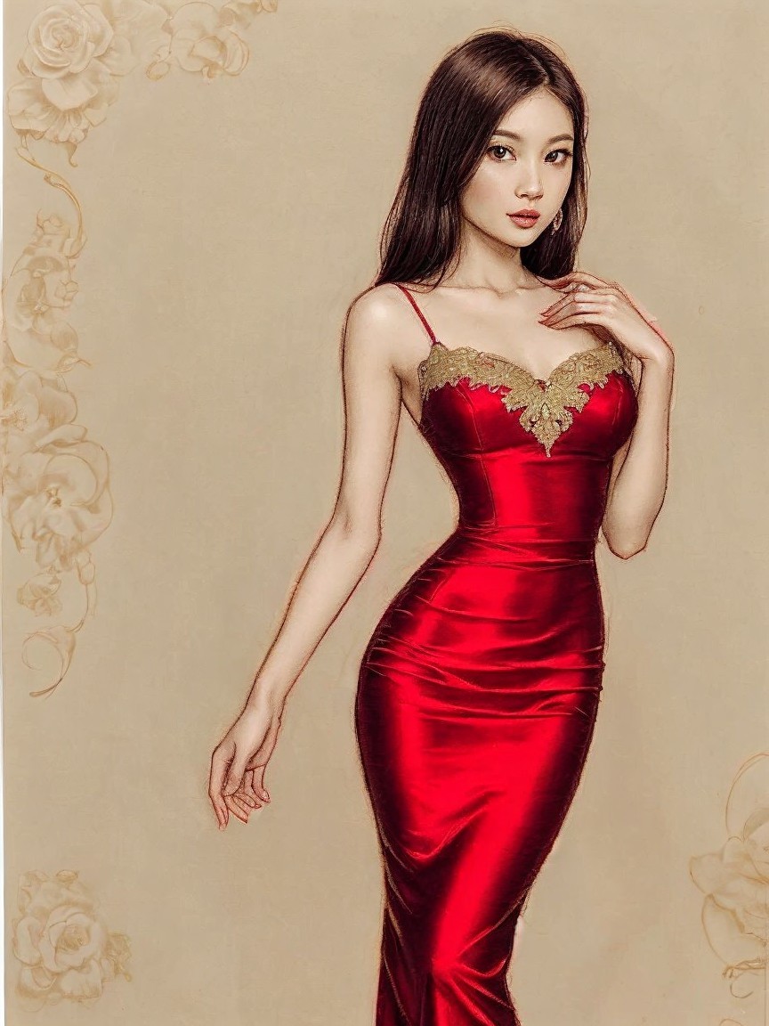 Prompt: ruby red and gold colored pencil sketch of an asymmnetrical, partly translucent dress worn by a petit european asian looking woman with small bosom, slender waist, beautiful face, elongated legs