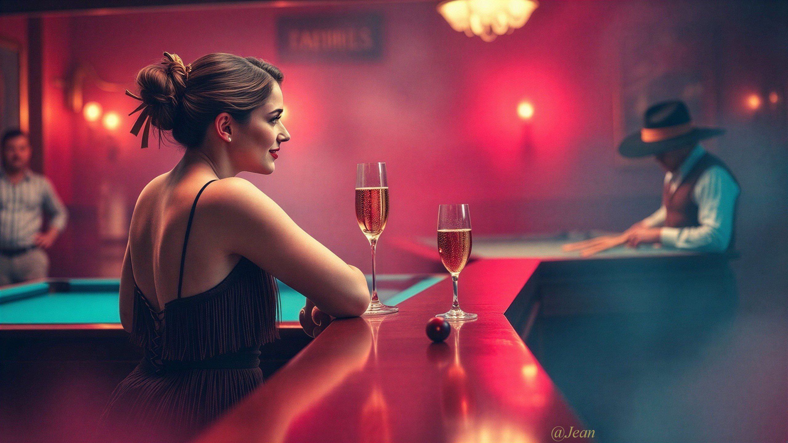 Prompt: The scene takes place in a pub. Leaning against a bar counter, a woman in a 1930s fringed dress, a ribbon in her hair, rests her elbows on the counter. She holds a glass of champagne in one hand and faces us. She watches with amusement and a smile as her partner plays billiards in the background with another man. Both men are dressed in striped shirts and trousers, one wearing a 1930s hat. The image is artistically enhanced with translucent gradations of cyan and magenta, and delicate bokeh lighting in the background, creating a dreamlike atmosphere. The color palette, composed of deep cyan and magenta and subtle warm hues, evokes a sense of tranquility and well-being, peace and serenity.