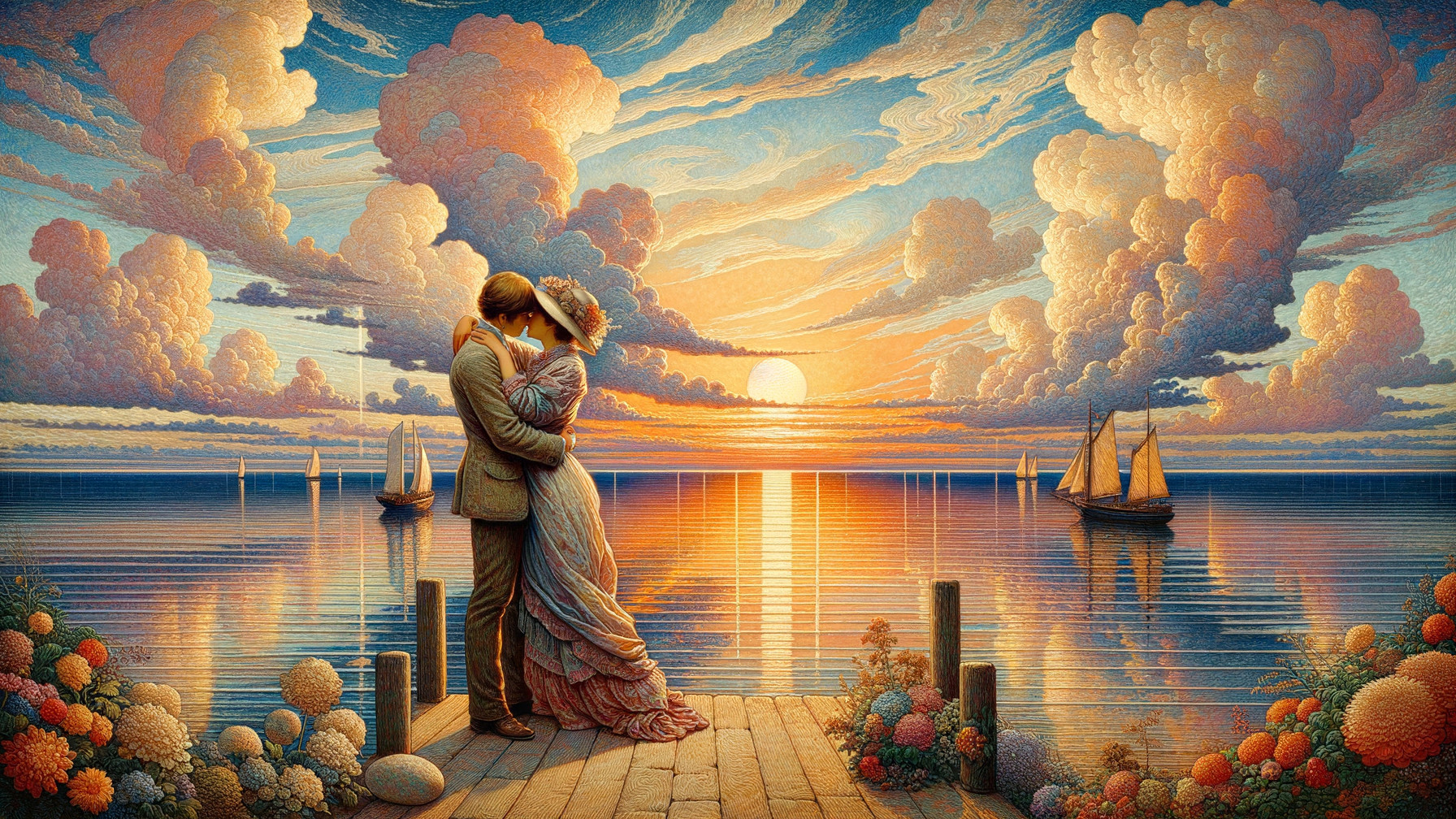 Prompt: A stunning closed-up view of a scene of two lovers embraced on a small pier watching the sunset, surrounded by sand and seascape. Gradient blue sky with sailboats in the far distance. Puffy clouds in the far distance. Sun rays shine through the clouds reflecting on the surrounding water. Touches of line to give the illusion of wind direction. The artwork features intricate patterns, vibrant colors, and rich textures, creating a harmonious masterpiece, whimsical wind, japanese art, fine art, soft light orange background, brighten the image, flowery stiching art