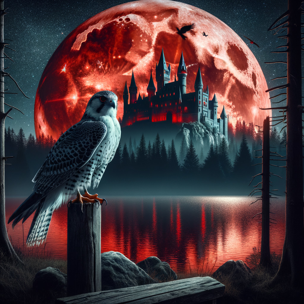 Prompt: A majestic snowy falcon perched on a rustic wooden ladder stands in the foreground, set against a dramatic gothic castle silhouette rising from a rocky cliff, bathed in a haunting crimson glow from a colossal full moon. The castle, with its sharp turrets and intricate architecture, dominates the horizon, enveloped by a serene lake that reflects the deep red hues of the moonlight. The scene is illuminated by sparkling stars scattered across a deep blue-black sky, creating a surreal contrast with the vibrant red background. Lush dark evergreen trees frame the edges, enhancing the mystical atmosphere, while the overall aesthetic leans towards cinematic fantasy with a touch of hyperrealism, evoking a sense of wonder and enchantment.
