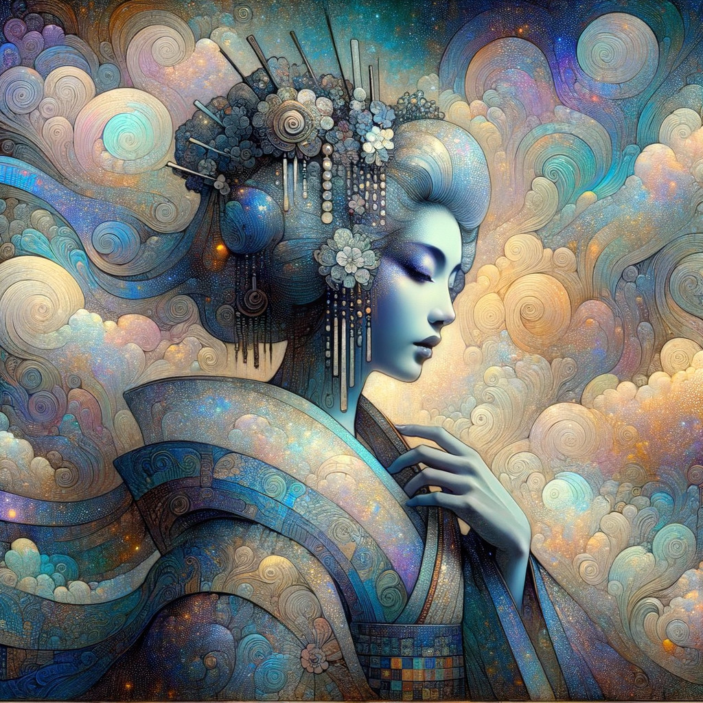 Prompt: "Ethereal portrait of a beautifully ancient geisha princess, dreaming of a Picturesque Utopian Wonderland" & Iridescent-NeoAndean Patchwork & Pastel Colors Of Royal Violet, Indigo Bloom, Slate Blue, Cloudy Sky, Fresh Sky, Sky Surge, Sky Blue (Light), Pearl Aqua, Turquoise, Aquamarine & By Yuko Shimizu (artist) & Alphonse Mucha (artist) & Stephen Bliss (artist) & Frank Miller (artist) & Todd McFarlane (artist) & Anthony Macbain (artist) & ∞