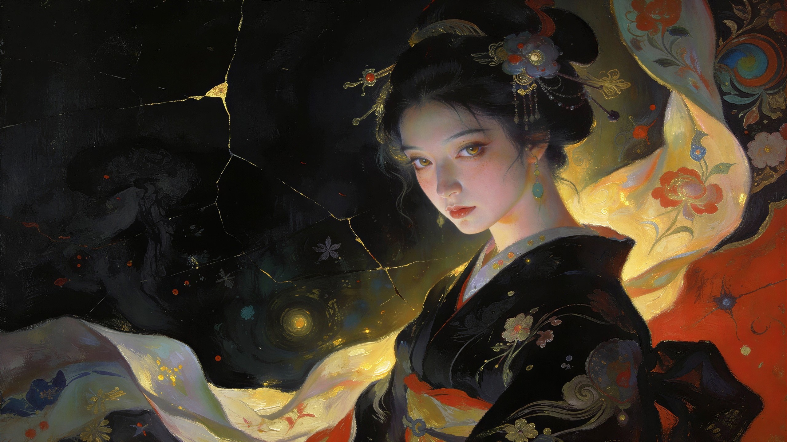 Prompt: Enigmatic ethereal beautiful East Asian young woman, mysterious aura, intricate details, dark and whimsical, traditional Japanese inspired attire, ethereal and surreal, enchanting expression, flowing fabrics, captivating eyes, symbolic elements, rich color palette, oil on canvas, fractured composition, masterful brushwork, reminiscent of Edward Gorey, Michael Parkes, Leon Bakst, Jean Brufal, and Richard Burlet, a fusion of Dee Nickerson's style and Egon Schiel's essence, Endre Penovac's fluidity, surreal and dreamlike ambiance.
