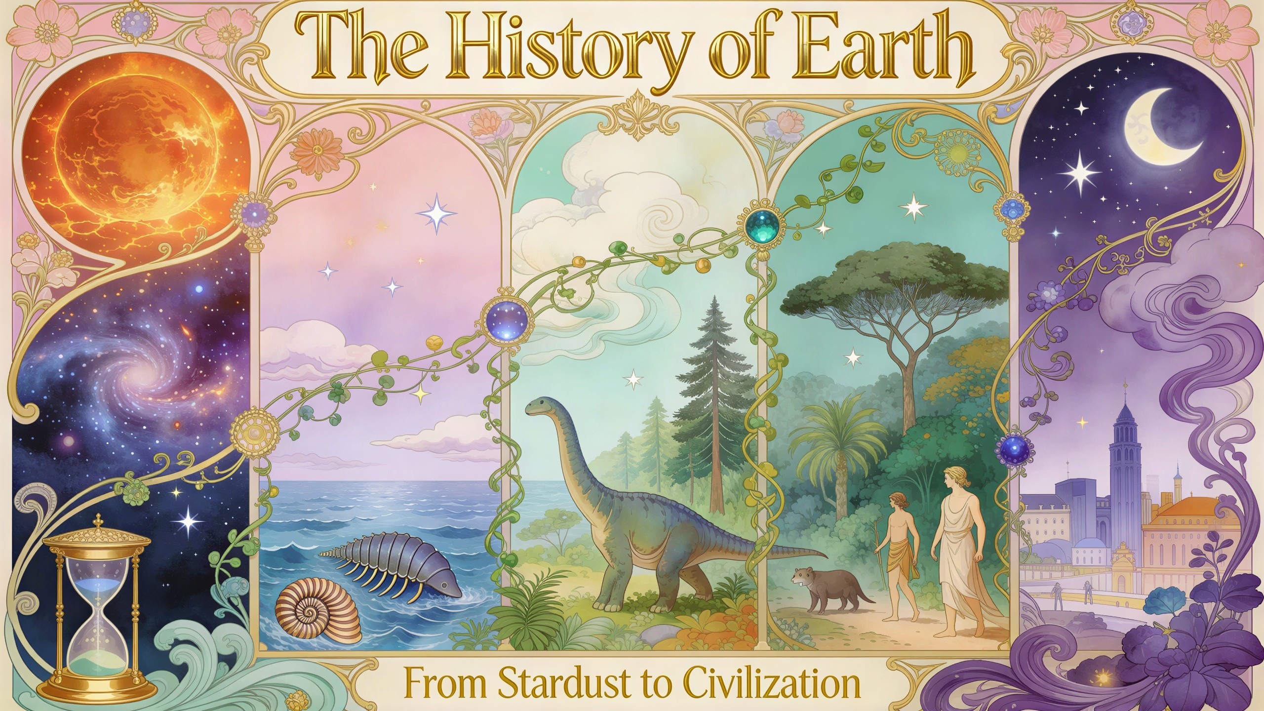 A richly detailed collage depicting the history of Earth, illustrated in elegant Art Nouveau style. Flowing organic lines, ornate floral motifs, and decorative borders connect different eras of Earth’s evolution: molten primordial Earth and cosmic nebulae, ancient oceans with trilobites and ammonites, lush prehistoric forests with dinosaurs, the rise of mammals, early humans, and modern civilization blending into nature. Use soft pastel tones, gold accents, and muted jewel colors. Stylized figures, symbolic representations of time and nature, swirling clouds, vines, and celestial elements. Composition feels harmonious, vertical poster layout, highly detailed, painterly, vintage illustration aesthetic inspired by Alphonse Mucha.
