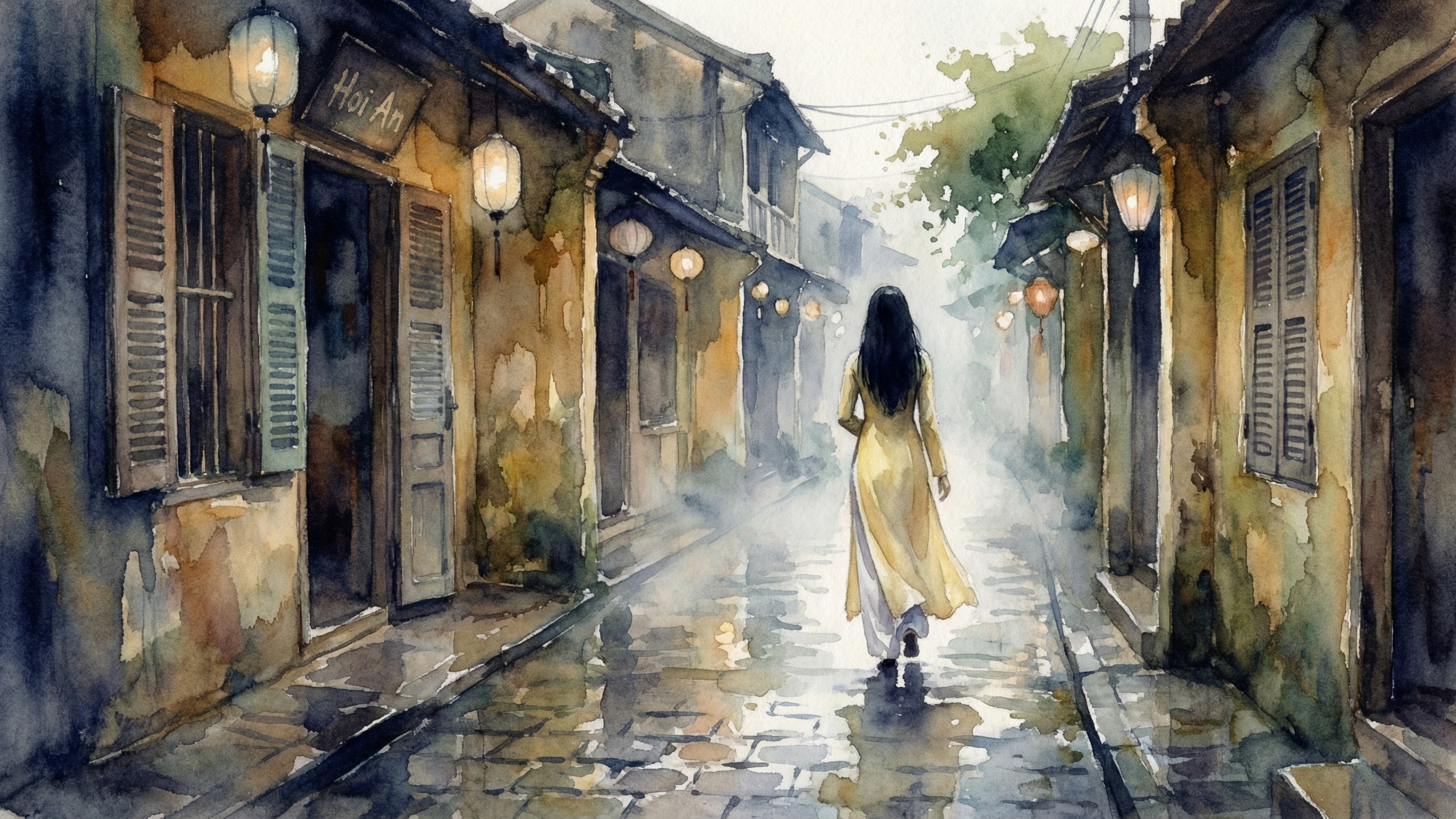 Prompt: Paint a dreamy hazy breezy wet on wet watercolour artwork, using minimal paints and maximum loose water effects, EmmAI winter colour palette, melancholy composition, minimalist, impressionist, a narrow, ancient alleyway in Hoi An, traditional lanterns casting dim light, her back to the viewers, a beautiful long haired woman dressed in yellow silk traditional Vietnames ao dai walks alone on the wet cobblestone path, aged wooden shutters, mystical atmosphere, shadows dancing, eerie silence, post-rain reflections, fog creeping in, hints of mystery, intricate details, contrasting textures, subtle color palette of yellows, blues, grays, and browns, EmmAI moody ambiance, reminiscent of a noir film scene.