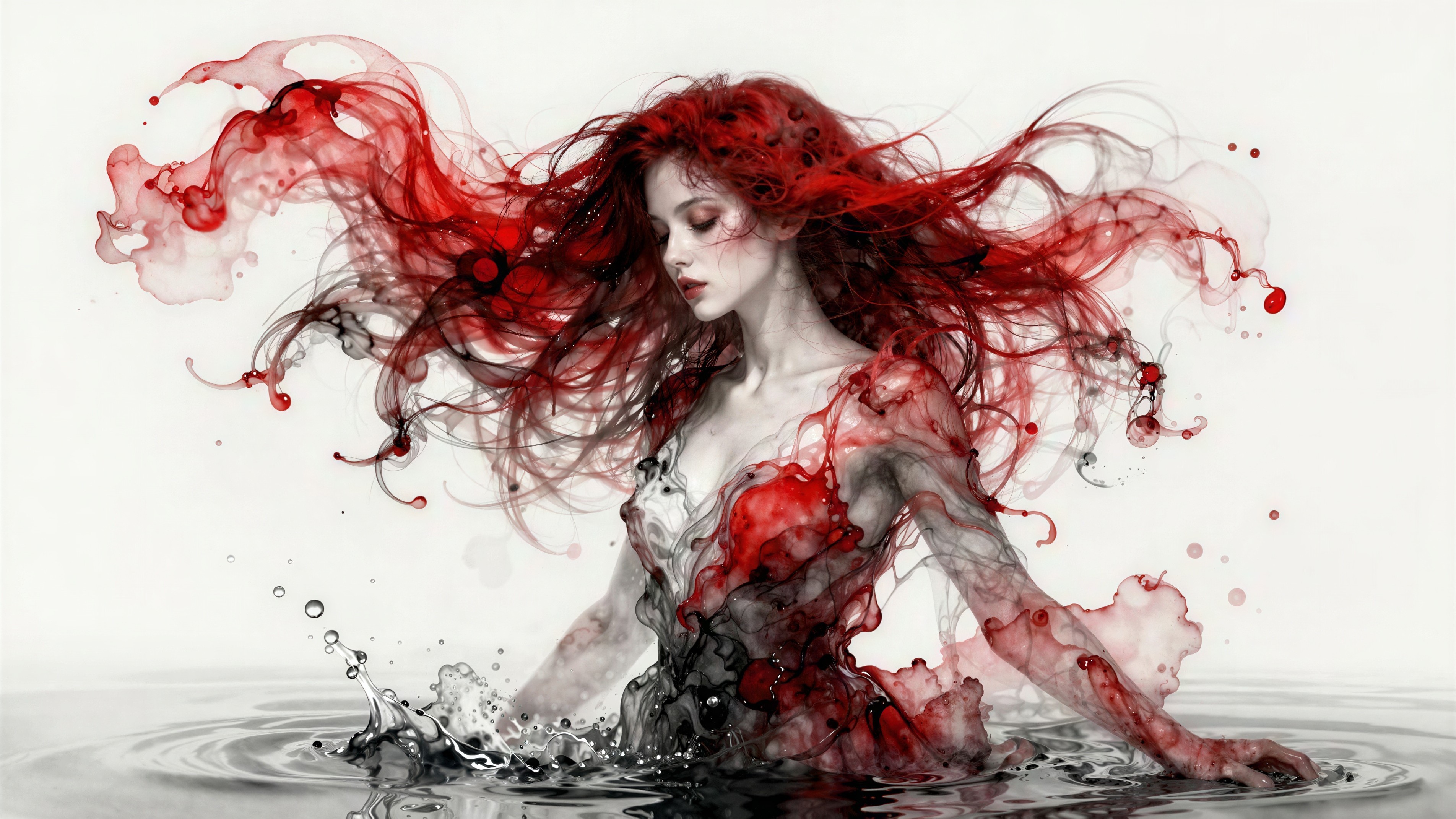 A rule of thirds minimalist of a hauntingly mystical woman with wild wind blown hair in flowing textured vibrant red and white wet on wet alcohol translucent ink and fine lined blends in off white and grey with a hint of black, her beautiful face partially obscured, with ink tendrils extending into intricate, with faint translucent watery splashes of abstract ink stains. The figure exudes an aura of mystery and power, the background is white minimal reminiscent in style of Aubrey Beardsley and Jackson Pollock art style liquid art painting. In a serene lake setting, a woman displays a playful moment as she flips her very long hair back, creating a dramatic splash of dripping colorful in pouring medium, crimson-red, white and black. The composition captures the water droplets in mid-air, emphasizing movement and energy.