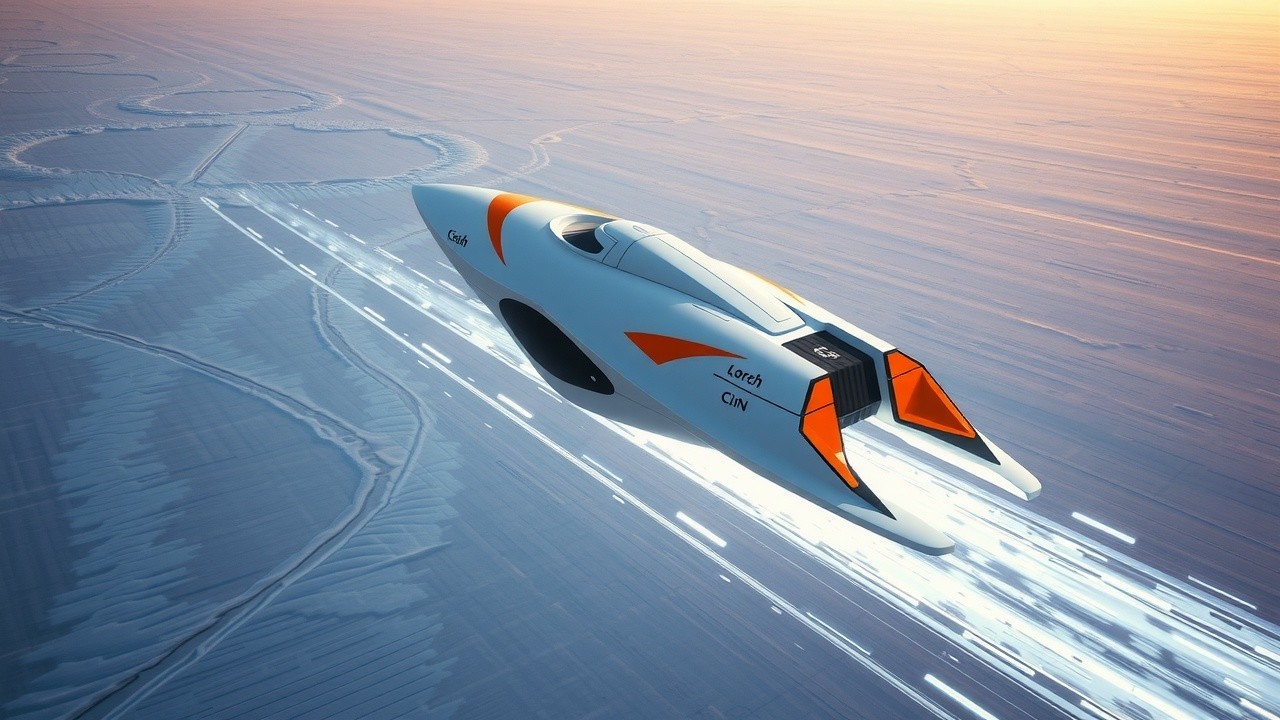 Prompt: Far wide-out shot of a futuristic X-wing glider hovercraft with soft, rounded, thick contours. The craft is bright white with vivid blue, black, and orange accents. It cruises at hyper-speed across a vast frozen tundra, leaving a shimmering trail of kinetic frost.
