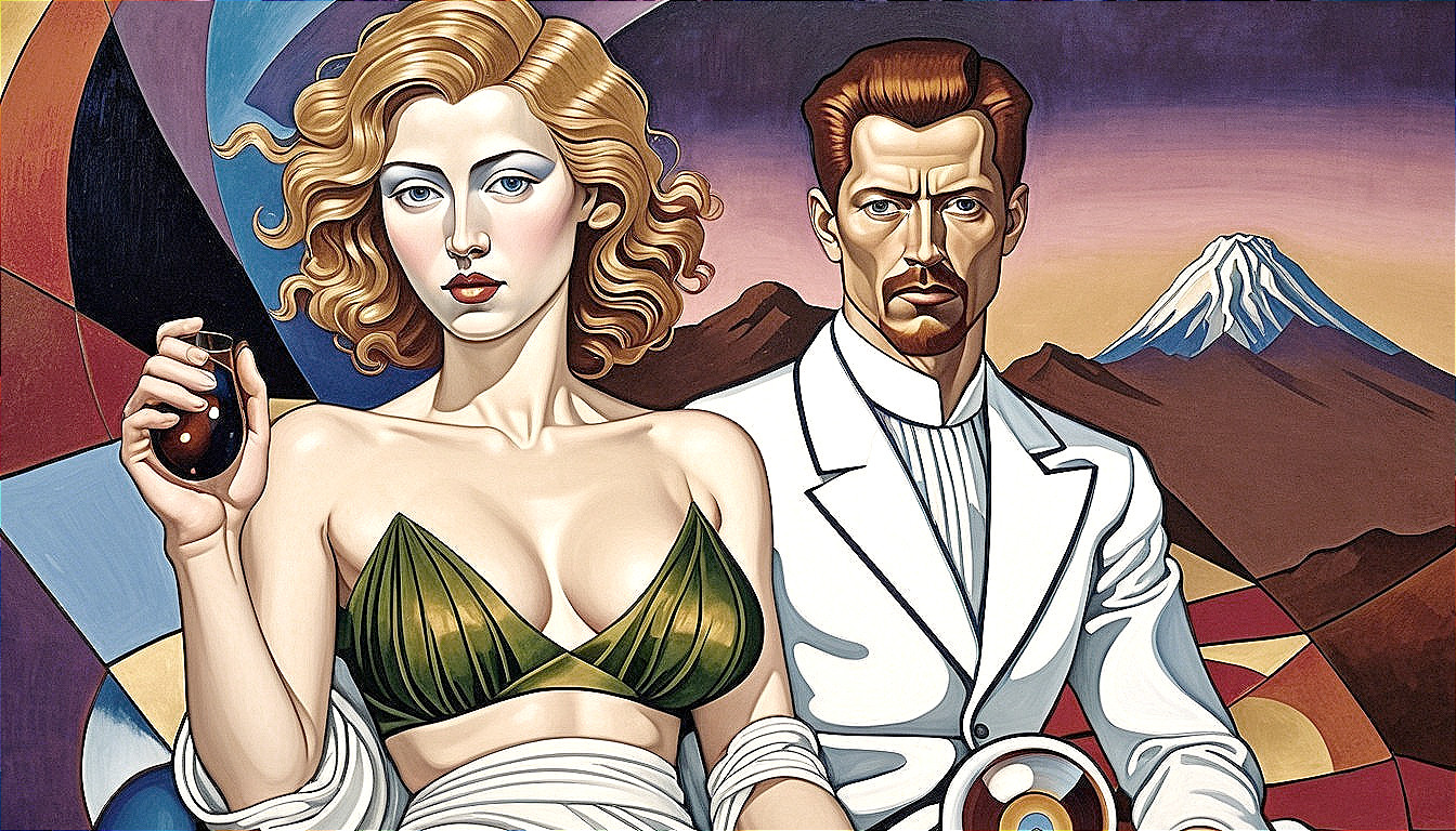 Vibrant Duo Against Abstract Mountains