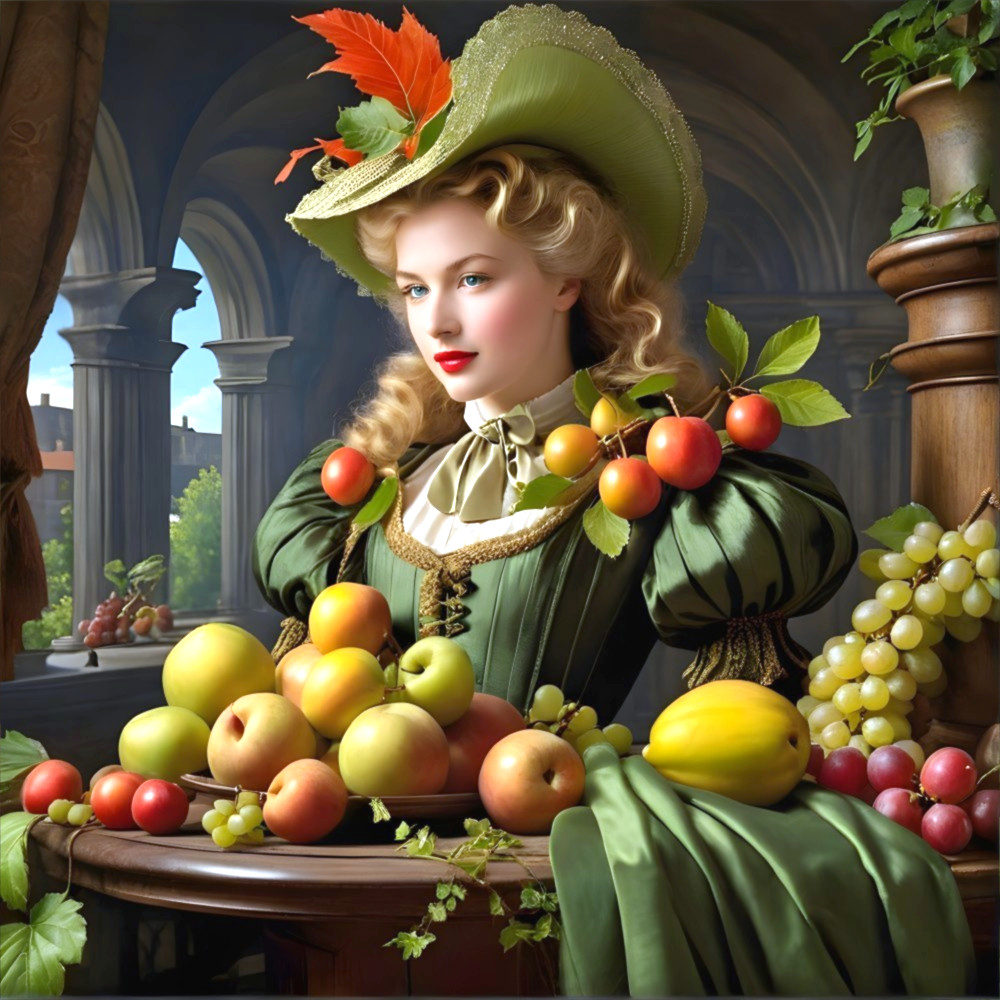 Elegant Woman with Roses and Apples