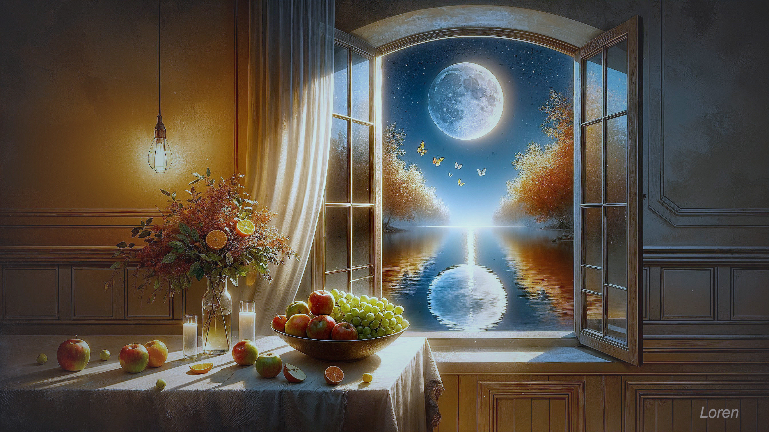 Moonlit Cat with Apples and a Castle 1
