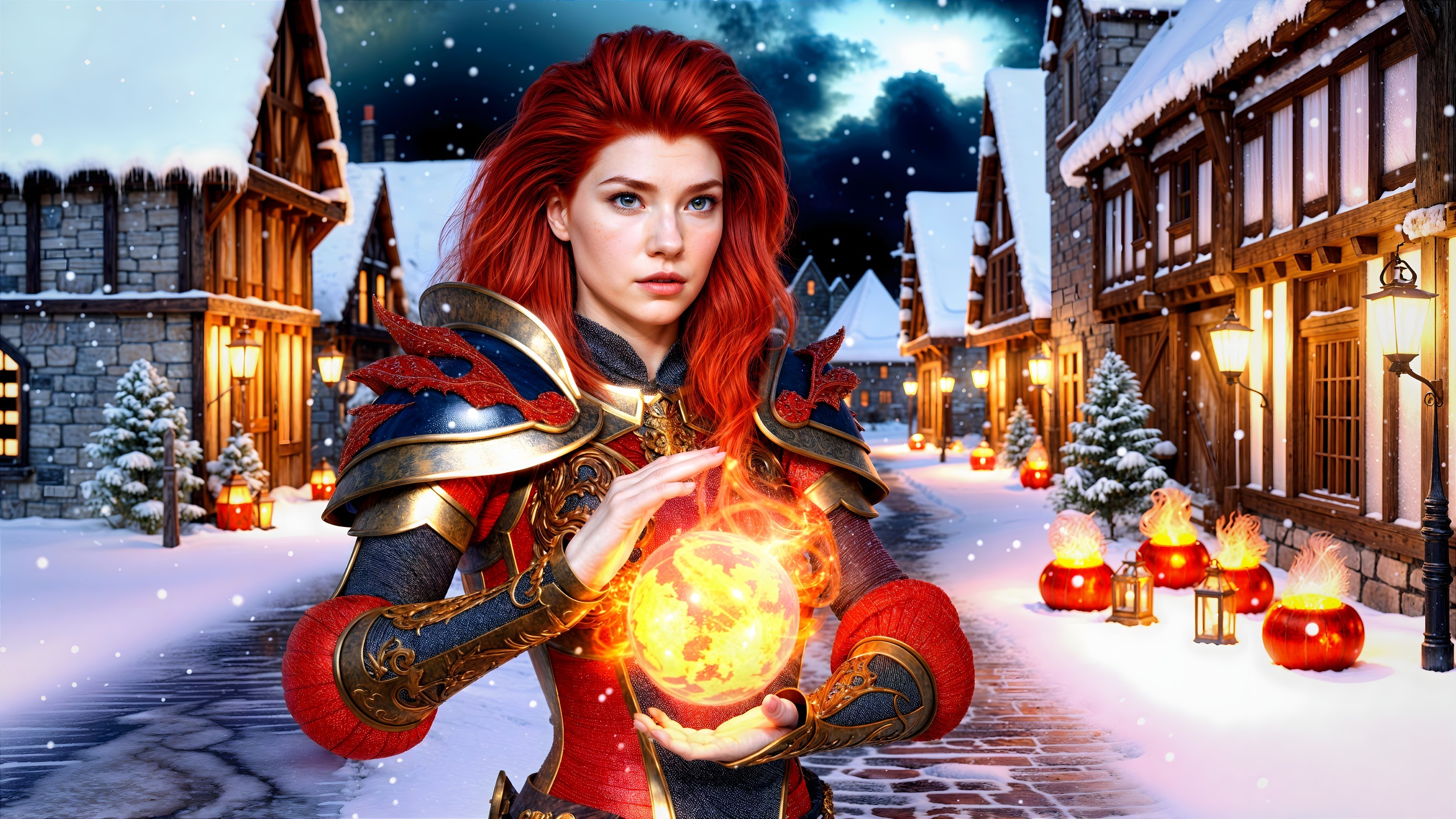 Fiery Mage in Snowy Village: A Magical Winter Scene