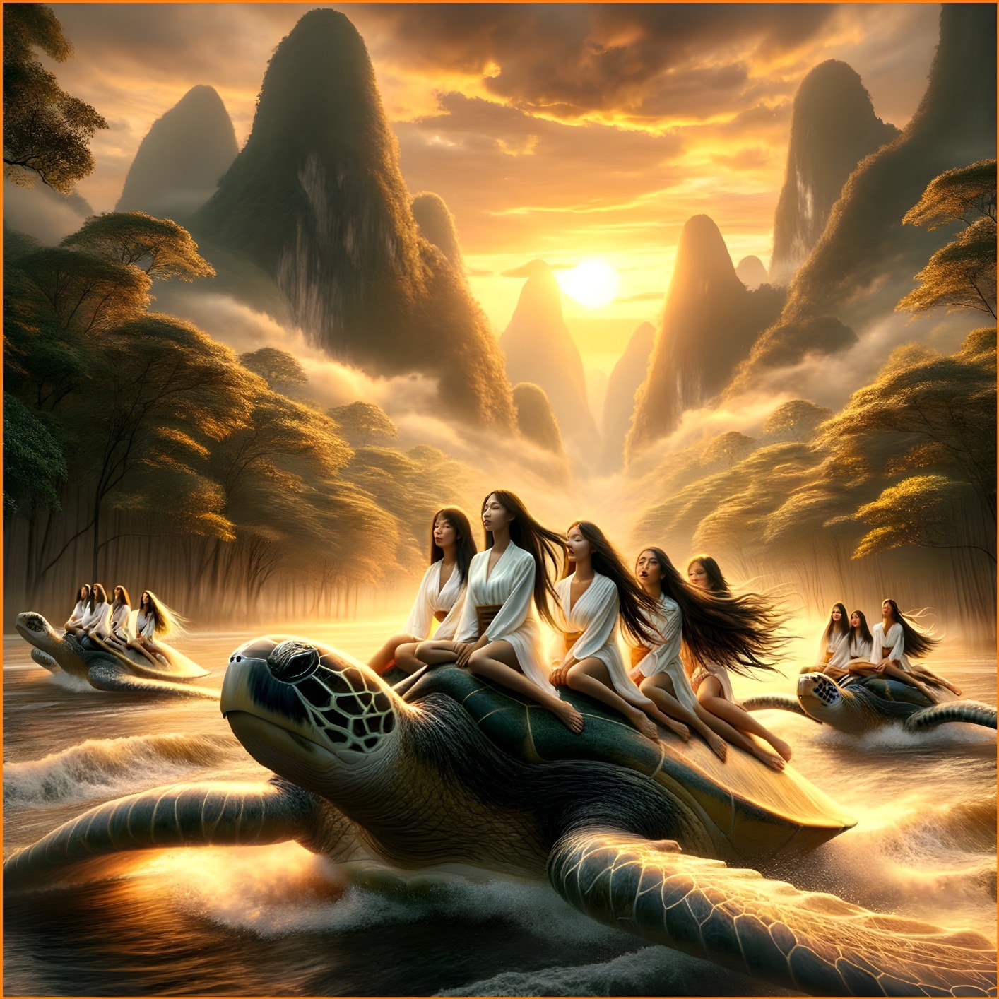 Sunset Serenity: Asian Women on Mystical Turtle Journey