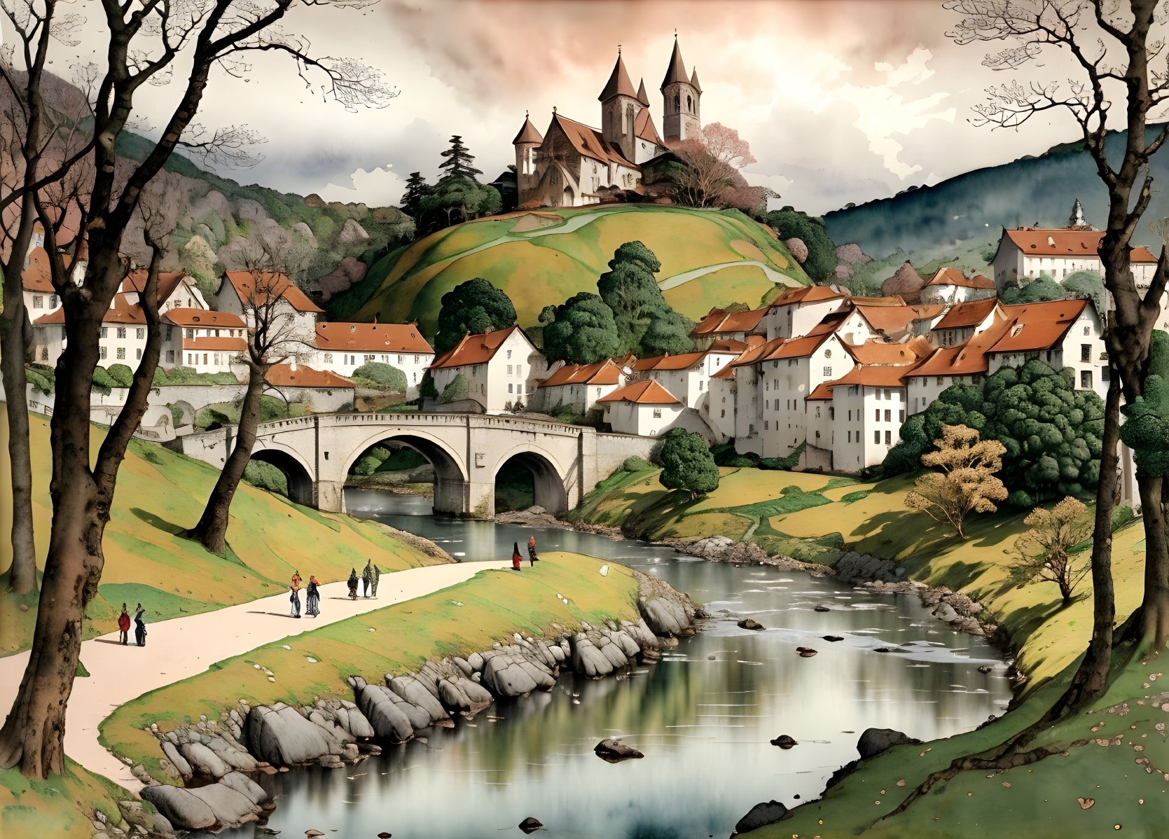 Autumnal Charm: Riverside Castle Village
