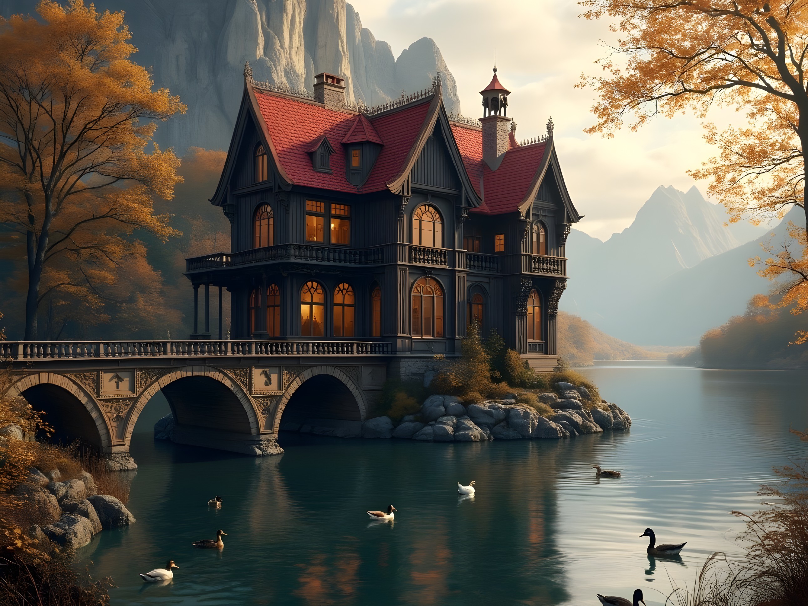 Magical Castle Amidst Autumn's waterfall in autumn atmospher.