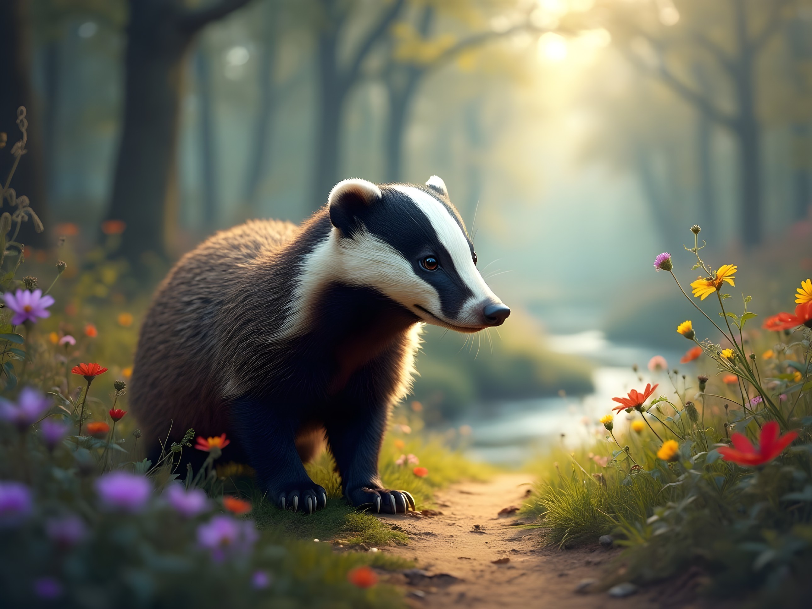 Whimsical Badger in a Blooming Meadow