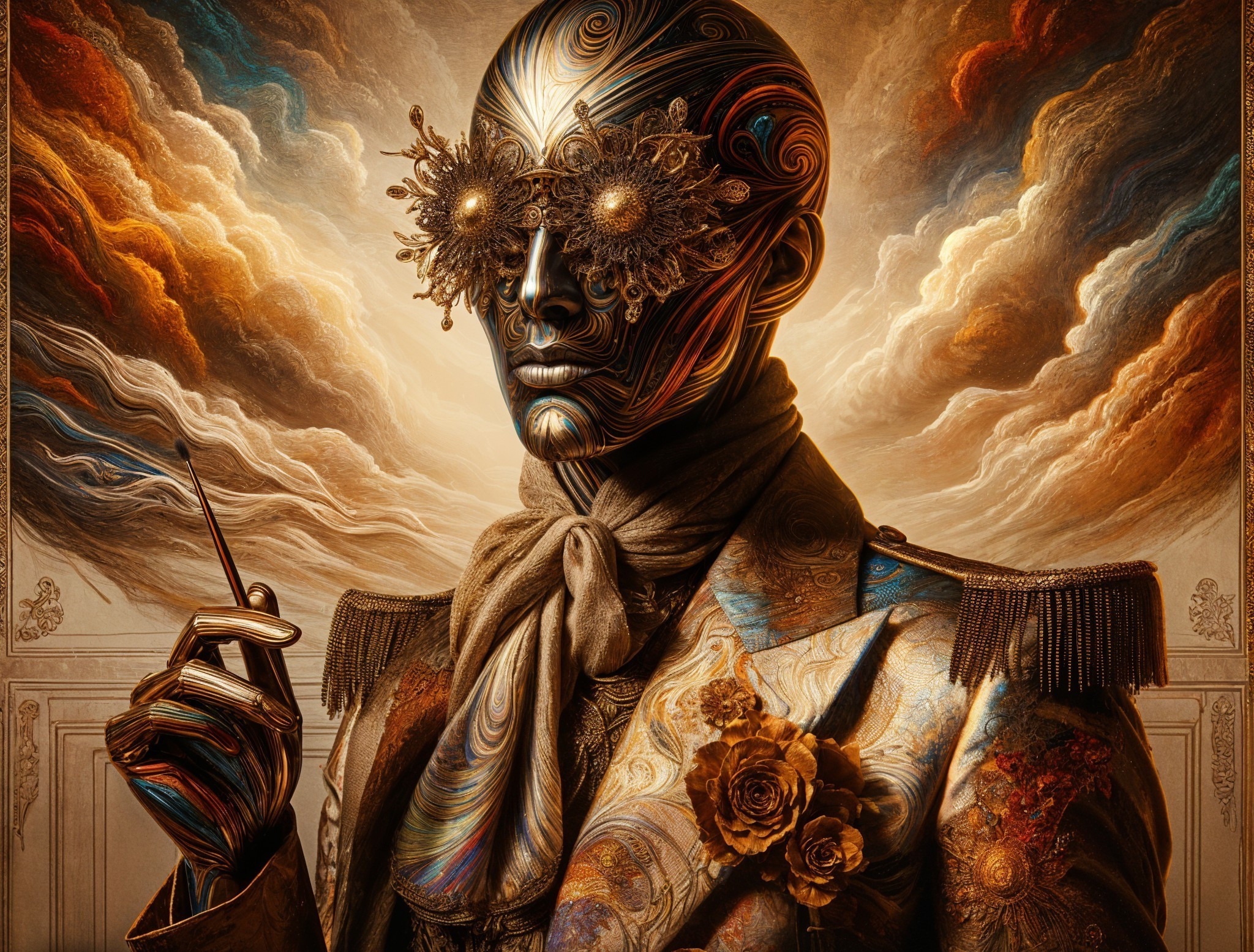 A digital artwork of a woman with elaborate gold and white mechanical headdress and armor