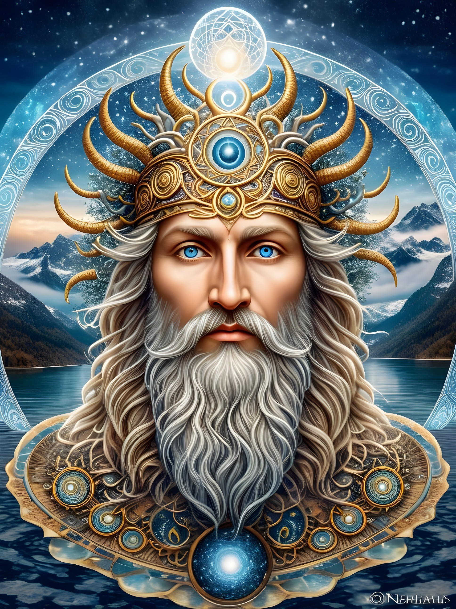The image depicts a serene figure with long hair and a beard,
