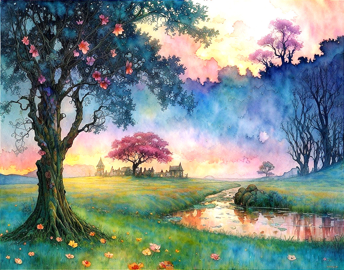 Blossoming Tree: A Watercolor Landscape