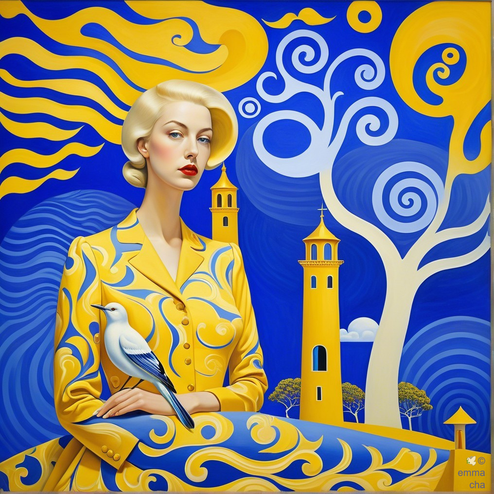 Woman in Blue Patterned Yellow Suit beneath a Yellow Patterned Sky