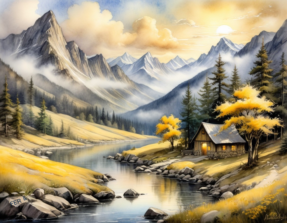 Cozy Cabin in the Woods Under A Snowy Cloudy Sky