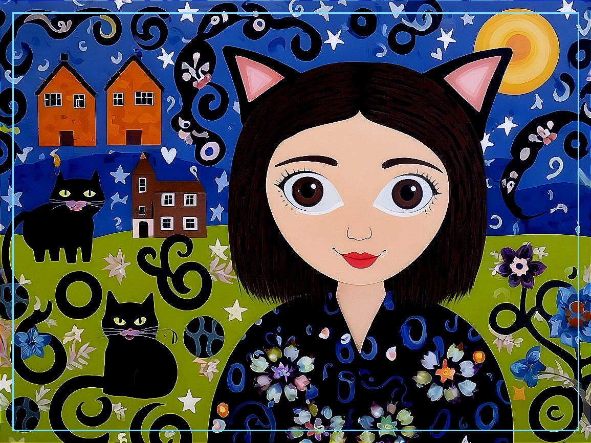 Enchanting Night: Woman and Cat Illustration