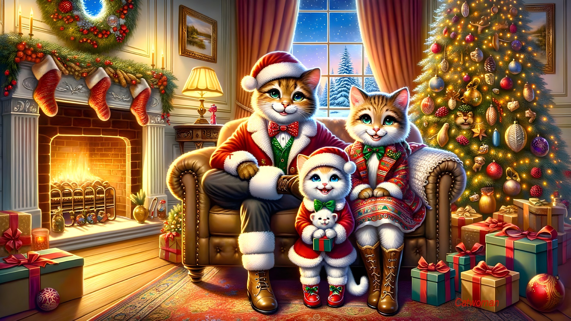Festive Cat Family Cozy by the Fireplace