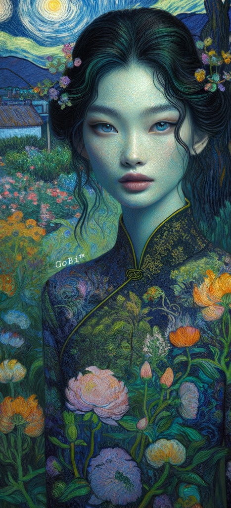 Elegant Woman in Floral Dress with Art