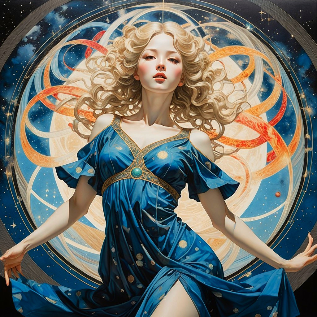 Depicts a woman in a blue robe surrounded by celestial patterns and swirling patterns