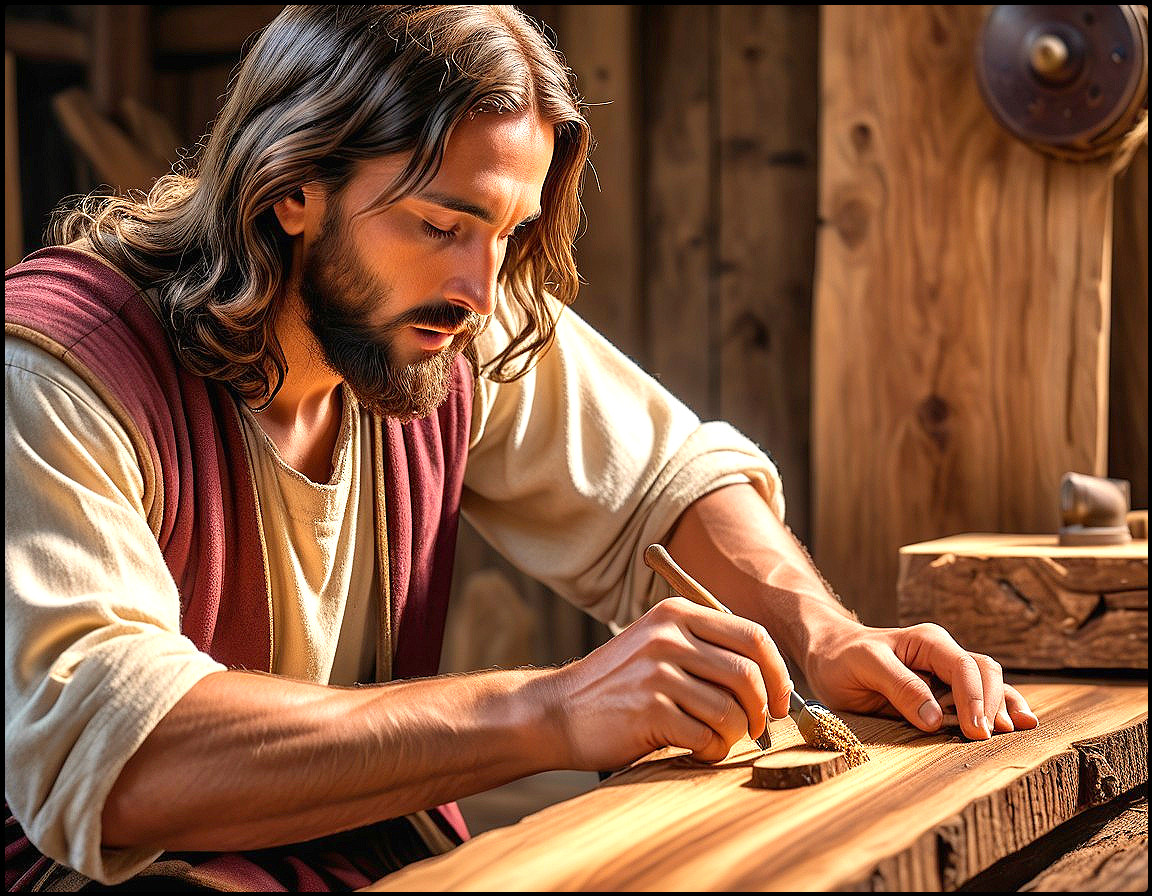 Jesus Masterful Craftsmanship in Sunlit Workshop