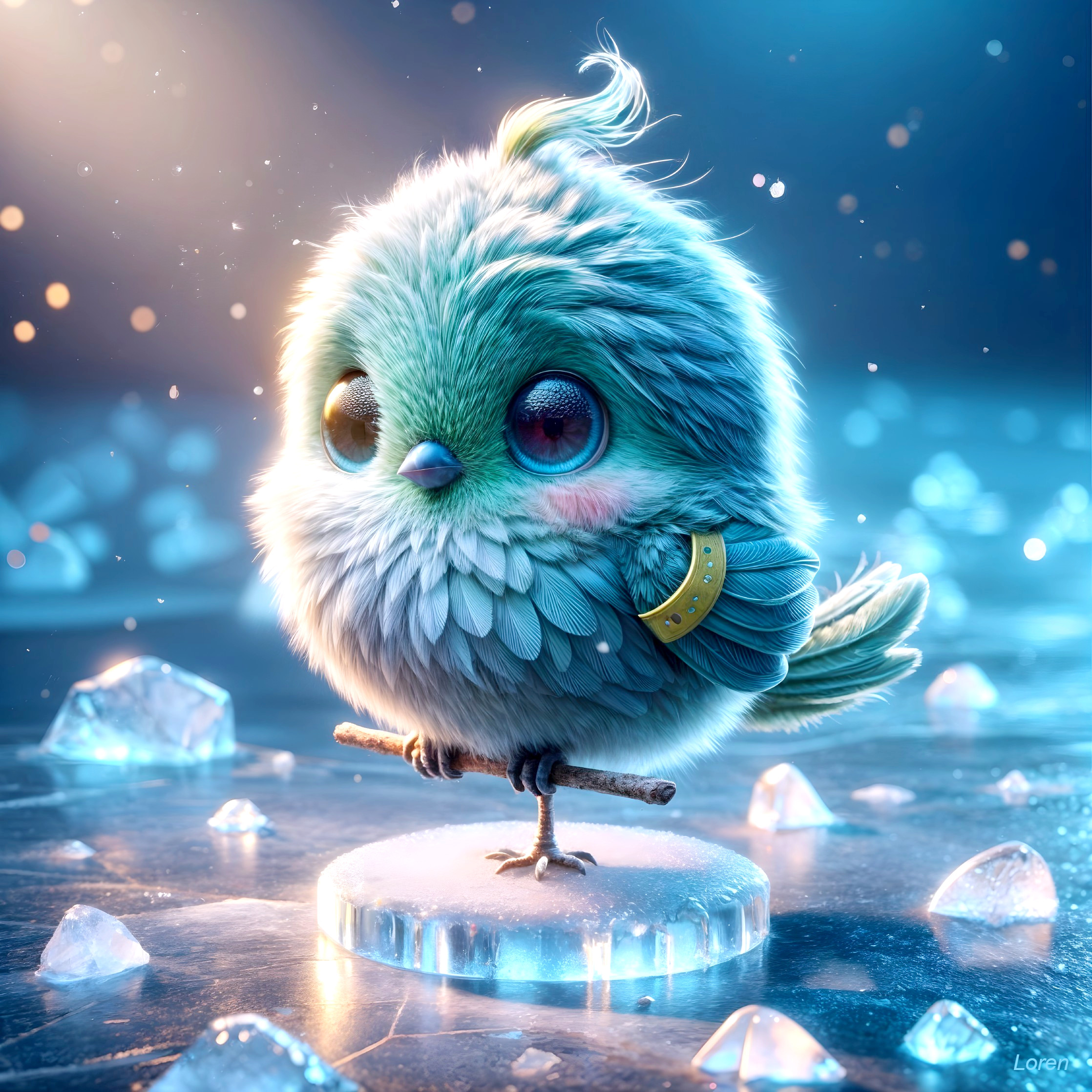 Fluffy Bird on Sparkling Ice Wonderland