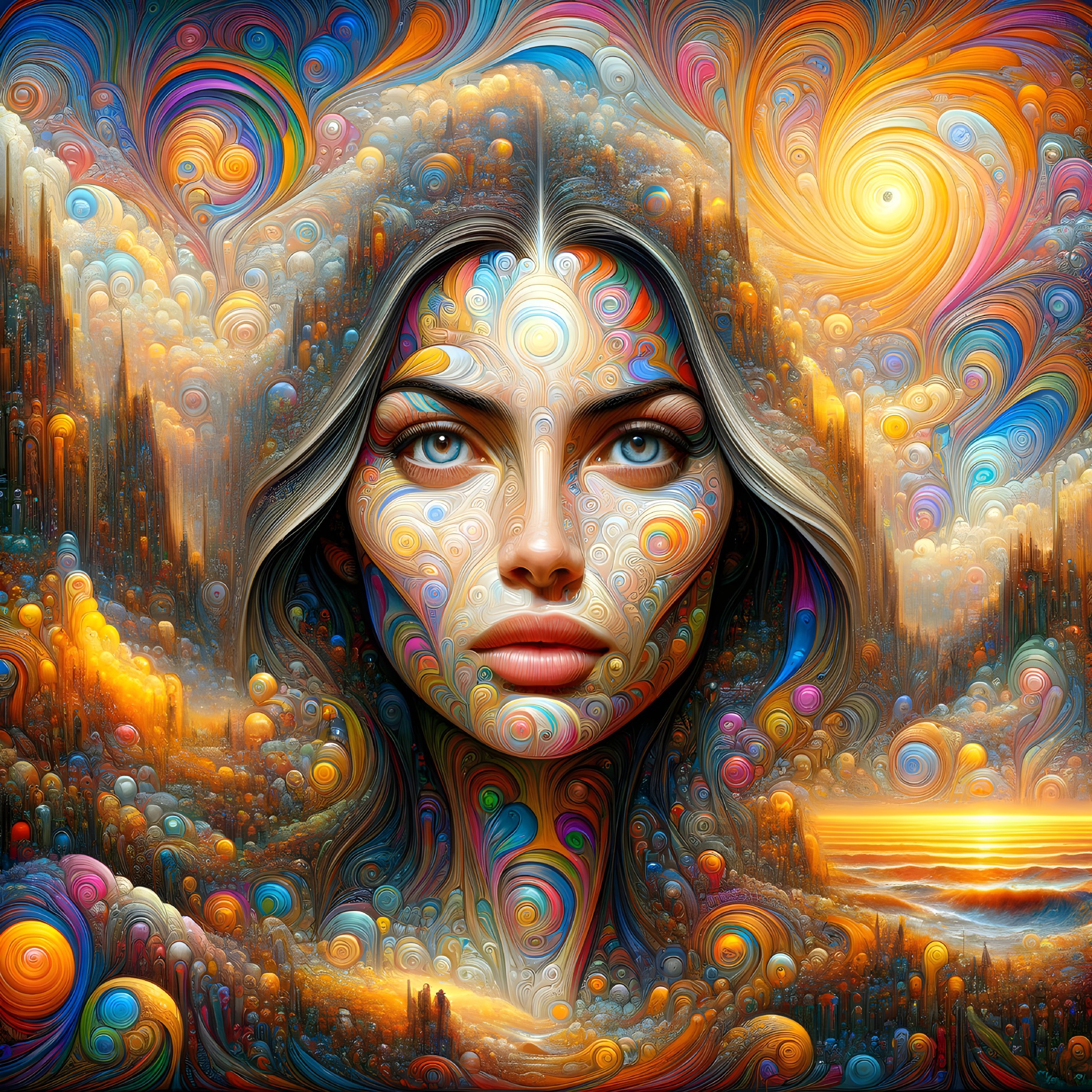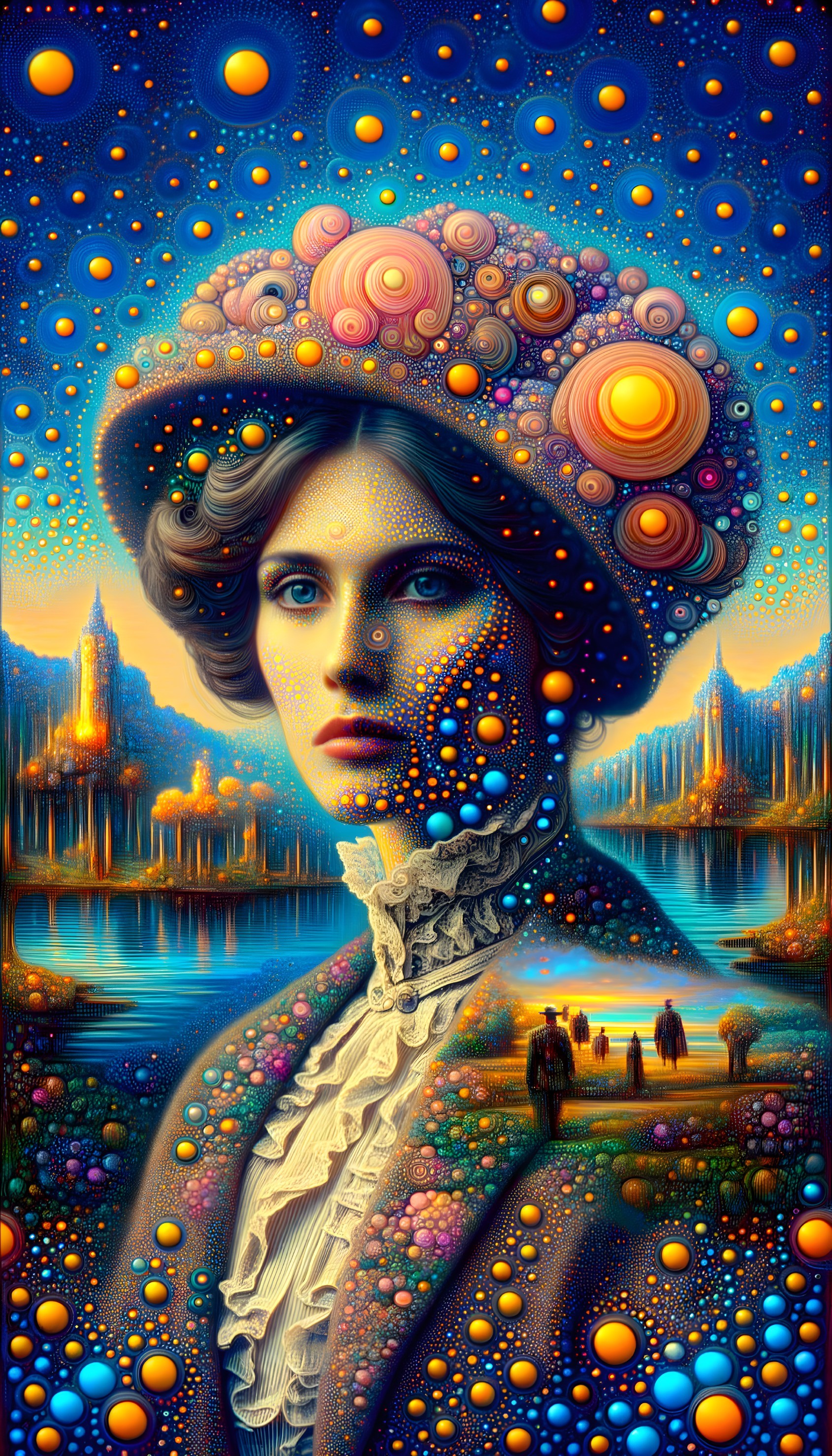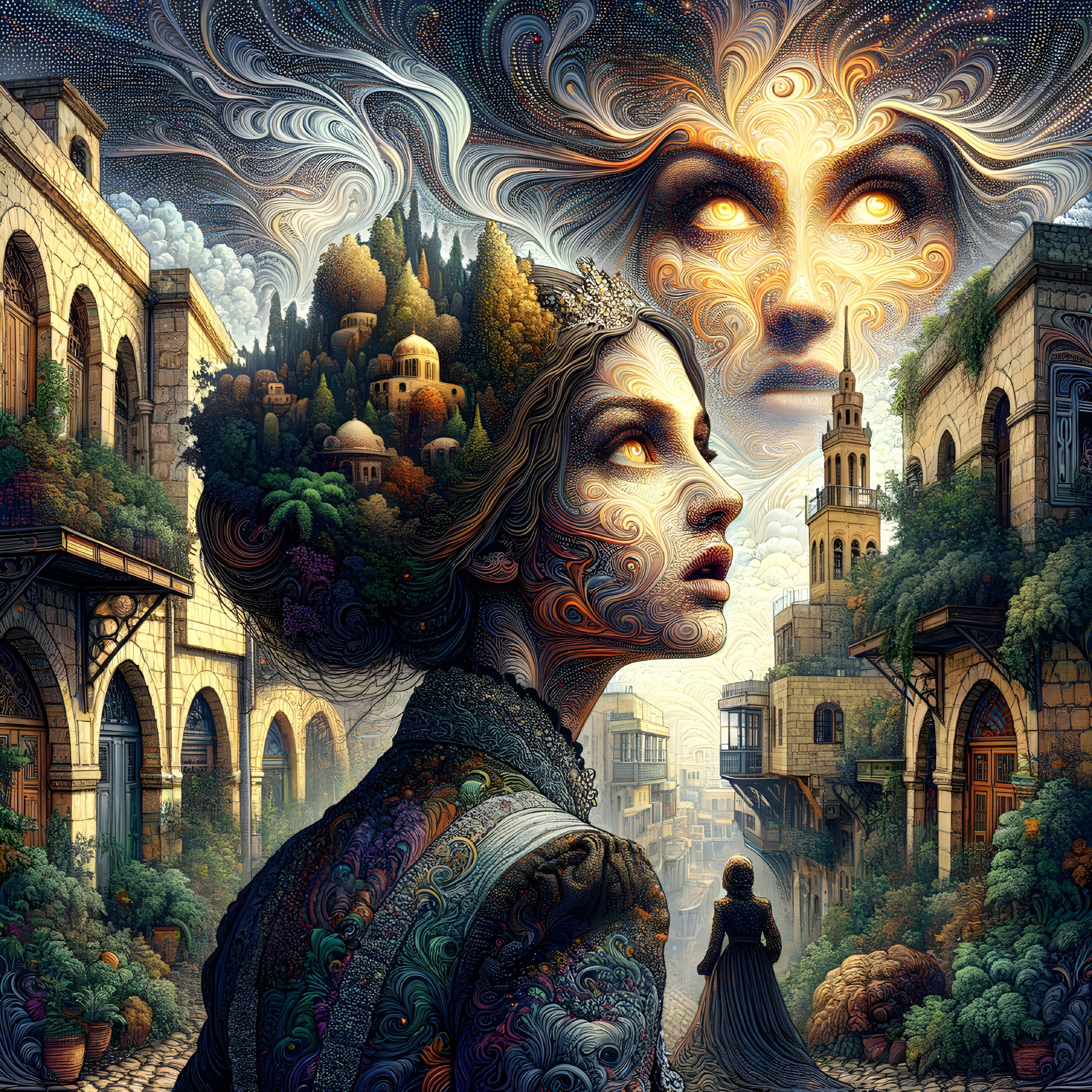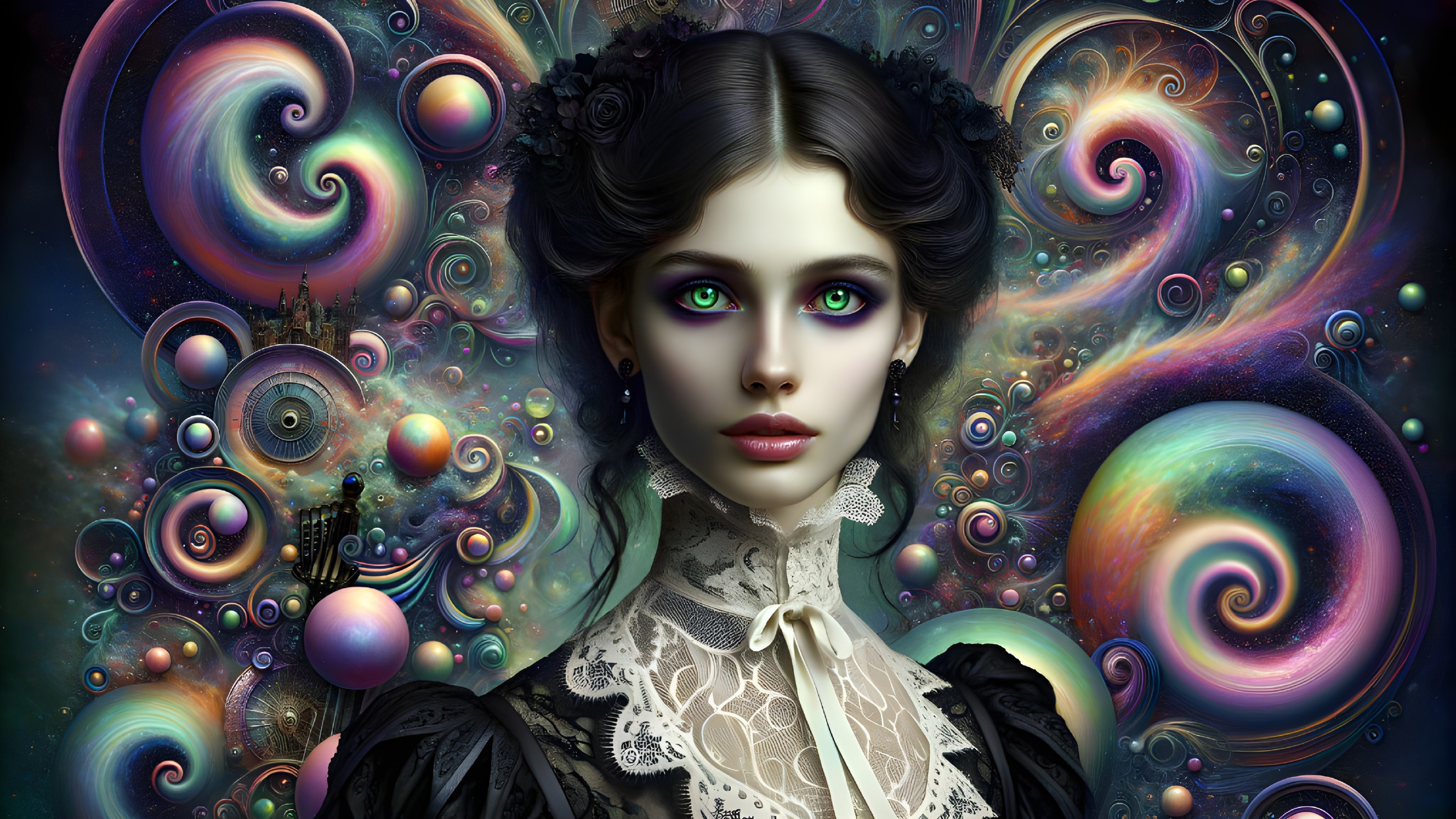 Cosmic Fusion: Woman's Portrait & Historical Landscape